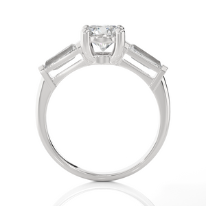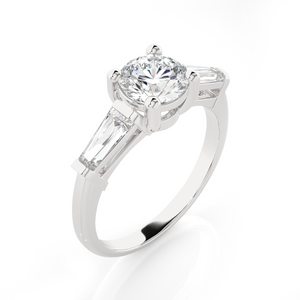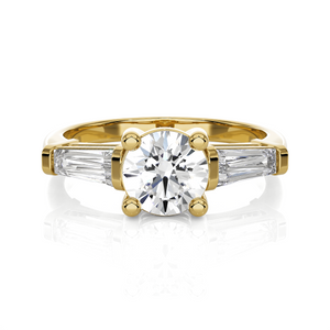 Choose a classic look for your special moment by selecting this brightly polished 14k/18k gold diamond engagement ring. A glittering round brilliant cut diamond secured in a four-prong setting complements the channel bar tapered baguettes on each side, forming a three-stone past, present, and future style setting with a sideways design.