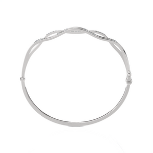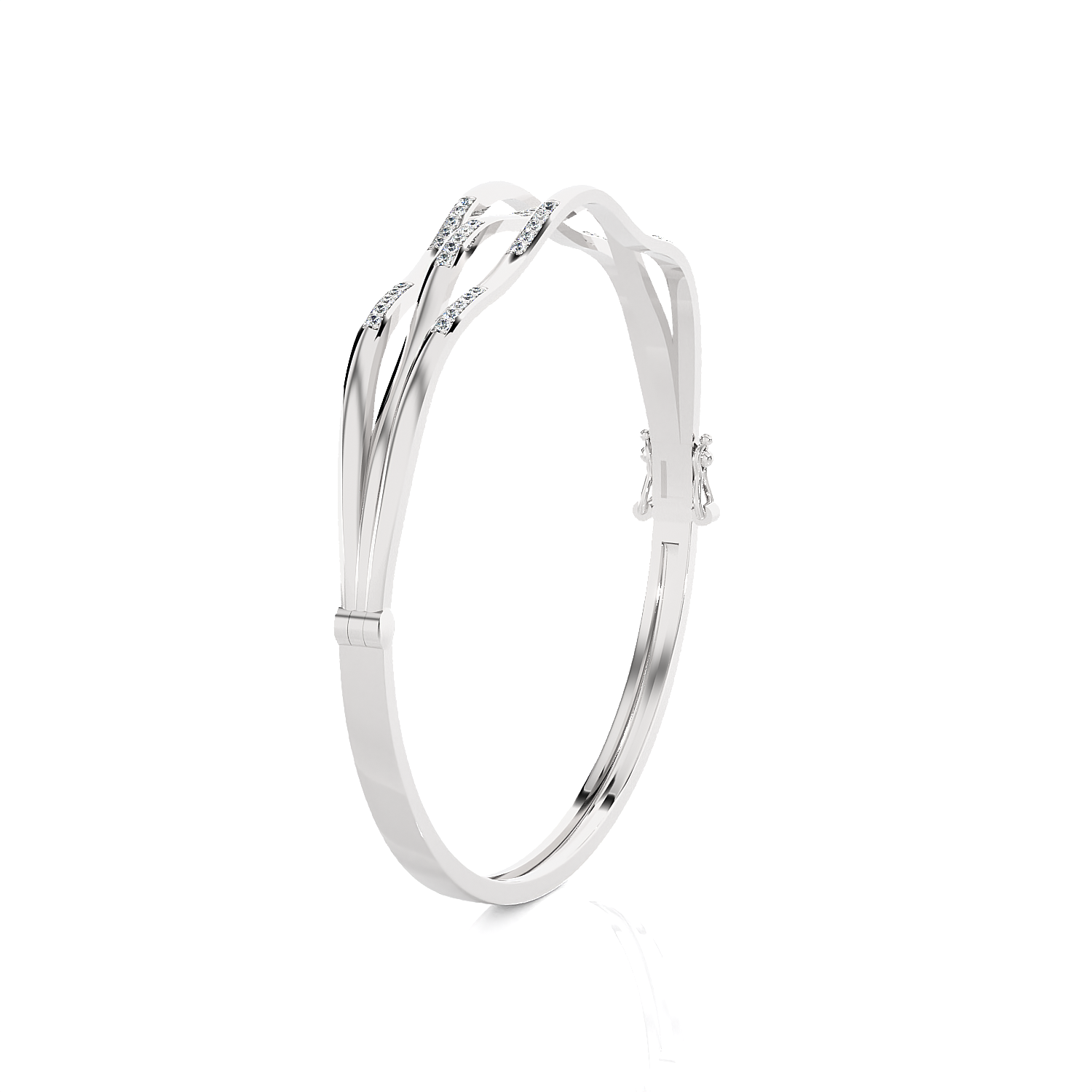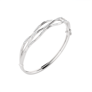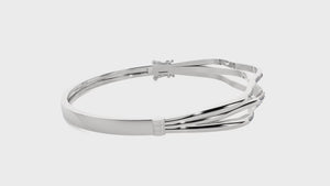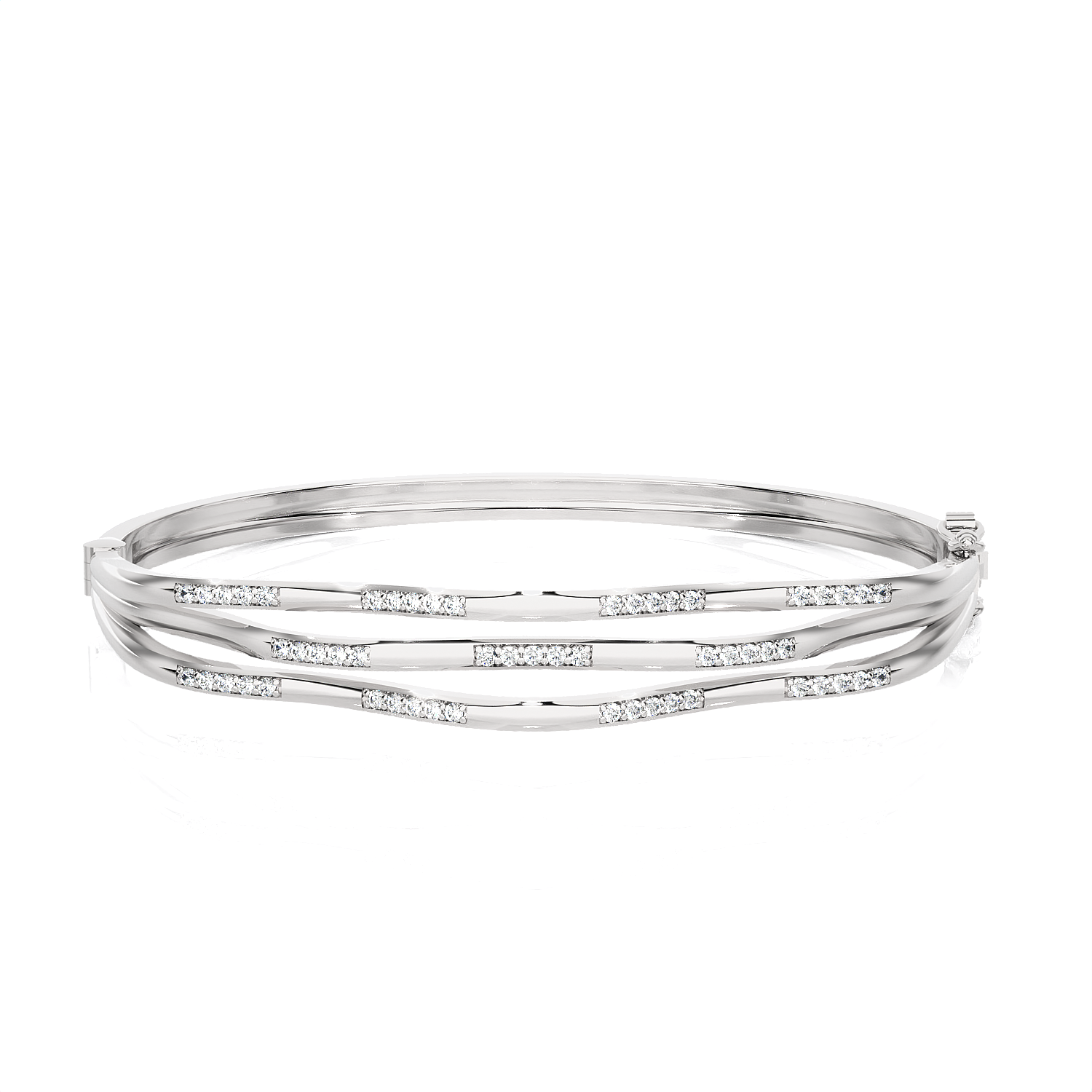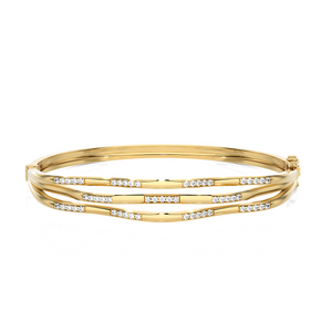 Three sparkling rows of round brilliant cut diamonds give this unique 14k/18k gold bangle bracelet luxury and pure elegance. A hinge on one side of this shiny diamond bracelet makes it easy to place on and remove from the wrist. Choose this elegant piece as an anniversary, birthday, or holiday present for your loved one.