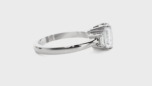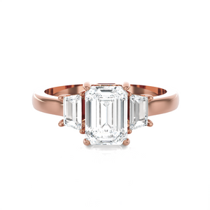 Make romantic memories last with Art Deco inspiration with this brightly polished 14k/18k gold three-stone ring. An emerald cut diamond secured in a four-prong setting nestles in the center, complemented by two shimmering baguette cut diamond sides, creating a past, present, and future design--celebrate time spent together with this stunning diamond ring.