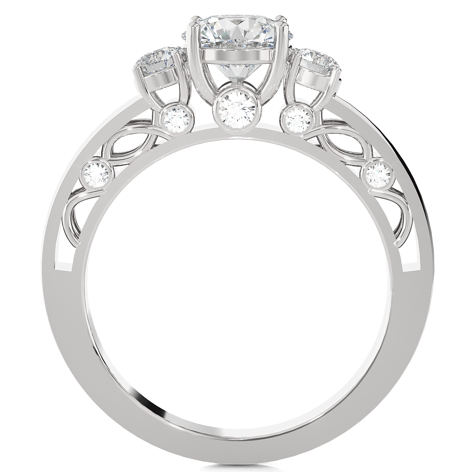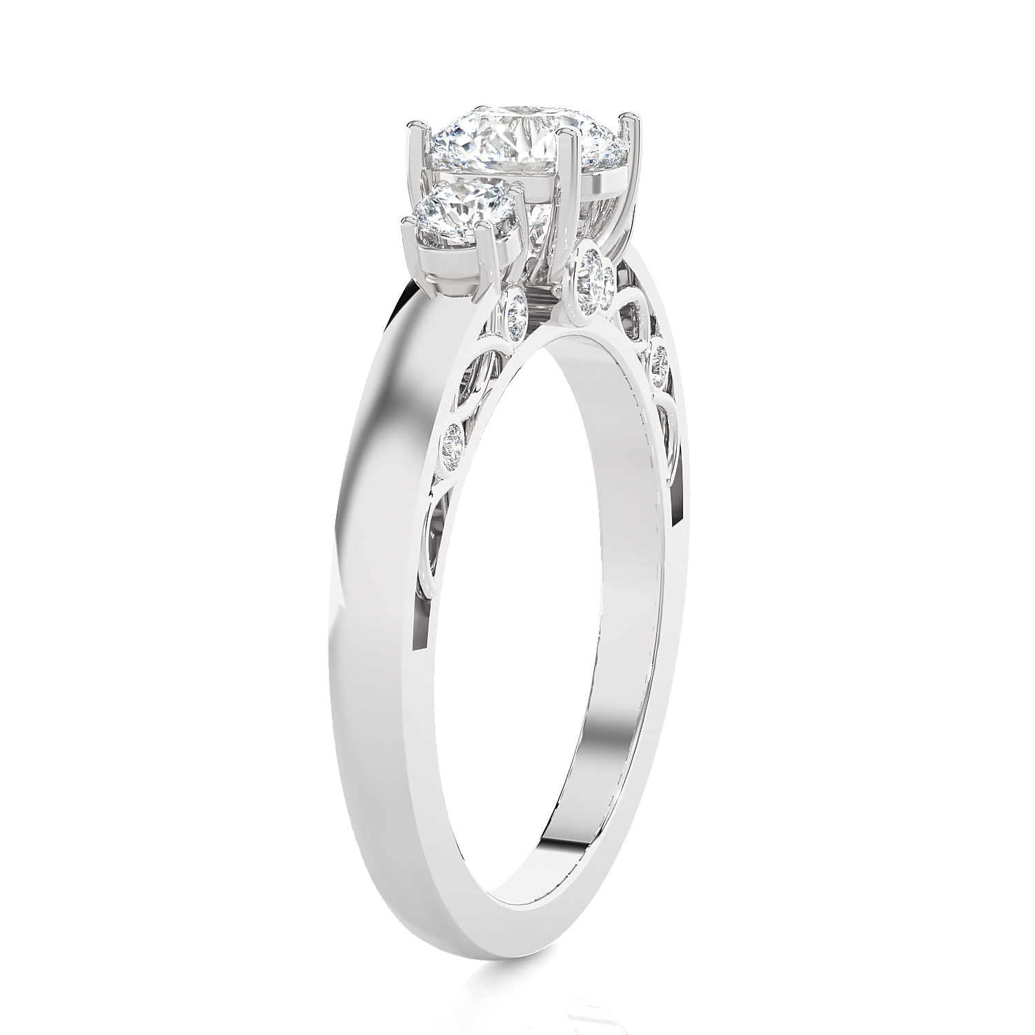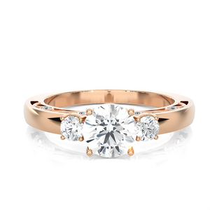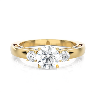 This unique 14k /18K gold diamond three-stone engagement ring is finely crafted in a rich shine, featuring a luxurious engraved pattern on the shank exuding vintage-inspired elegance with an ornate quality. A round brilliant cut diamond takes center stage in a four-prong setting, complemented by two smaller round brilliant cut diamonds. Hidden diamonds sparkle on the sides of the engagement ring, adding thoughtful notes of luxury.