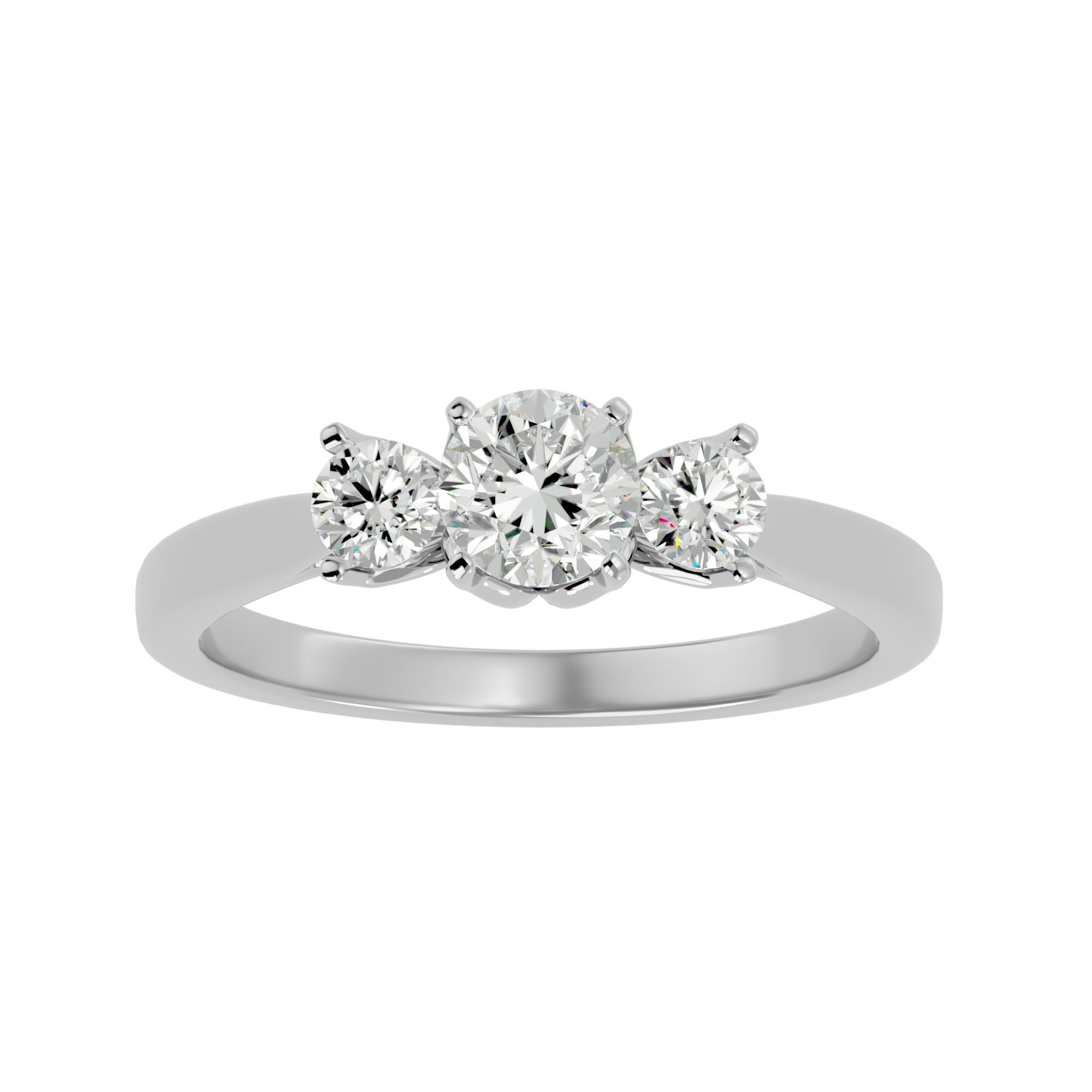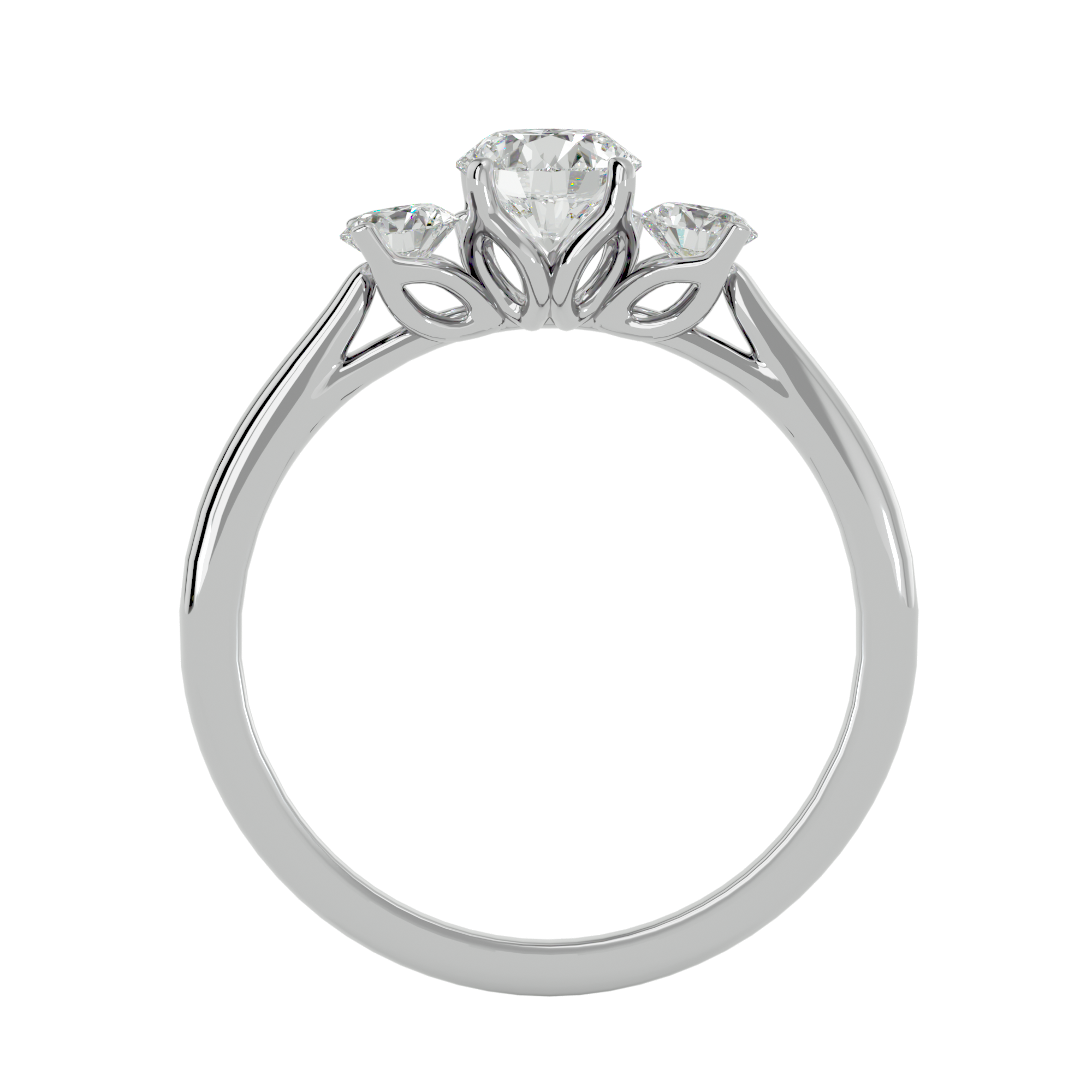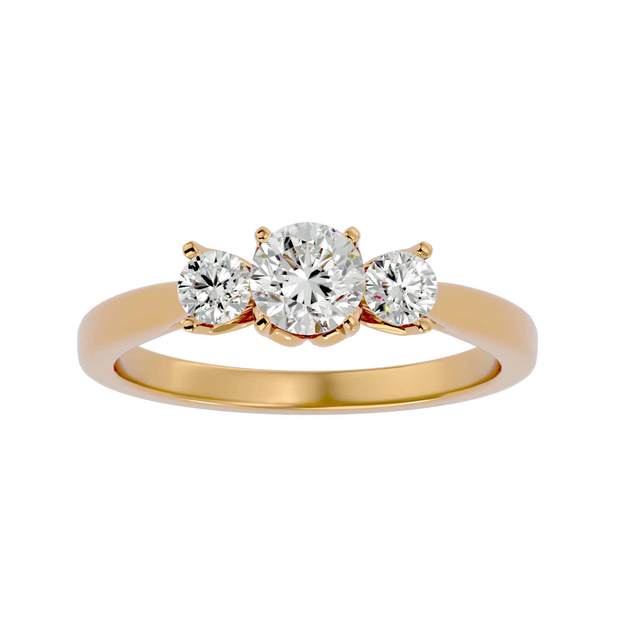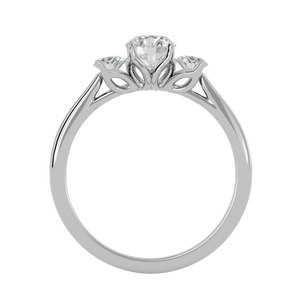 Enjoy the past, present and future setting through the vintage inspired three stone styling with the center diamond taking prominence flanked by comparatively smaller diamonds on the side, creating a snug look in this popular wedding and anniversary option in white, yellow or rose gold.