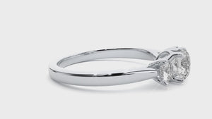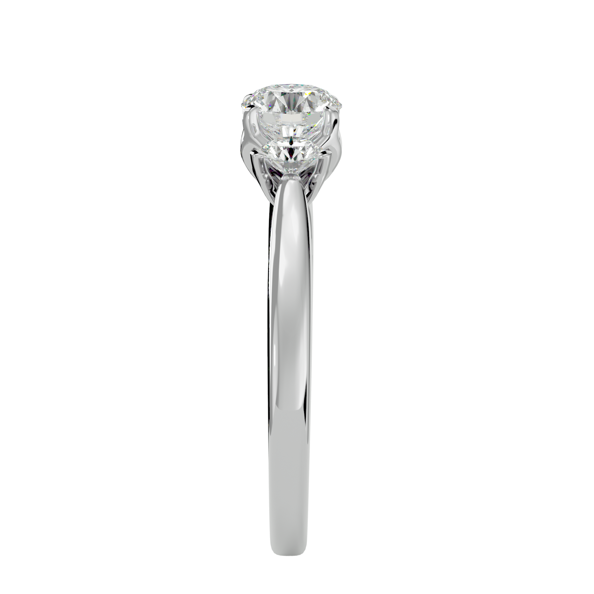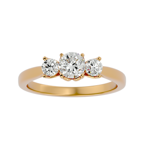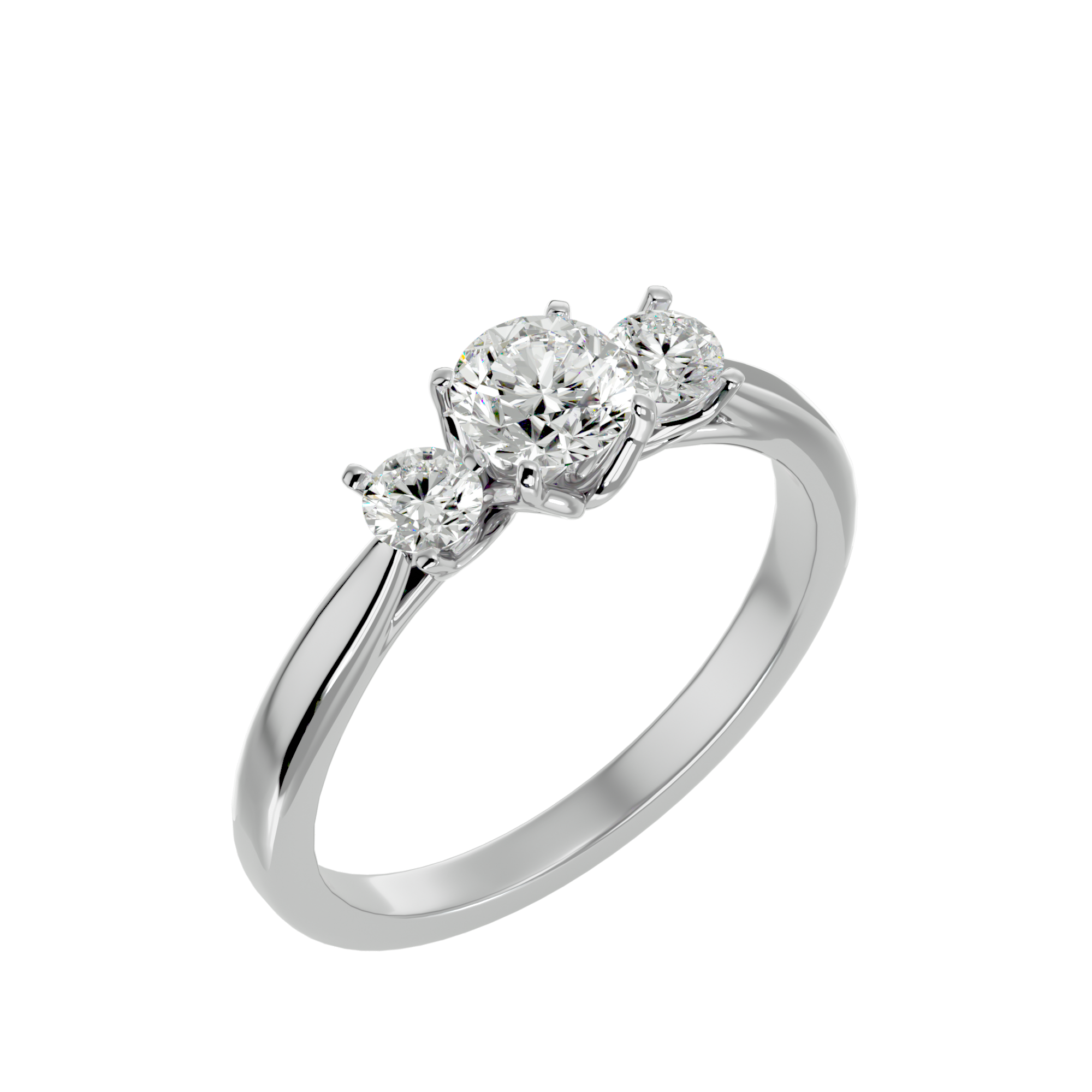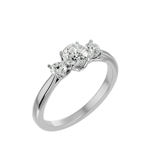 Enjoy the past, present and future setting through the vintage inspired three stone styling with the center diamond taking prominence flanked by comparatively smaller diamonds on the side, creating a snug look in this popular wedding and anniversary option in white, yellow or rose gold.