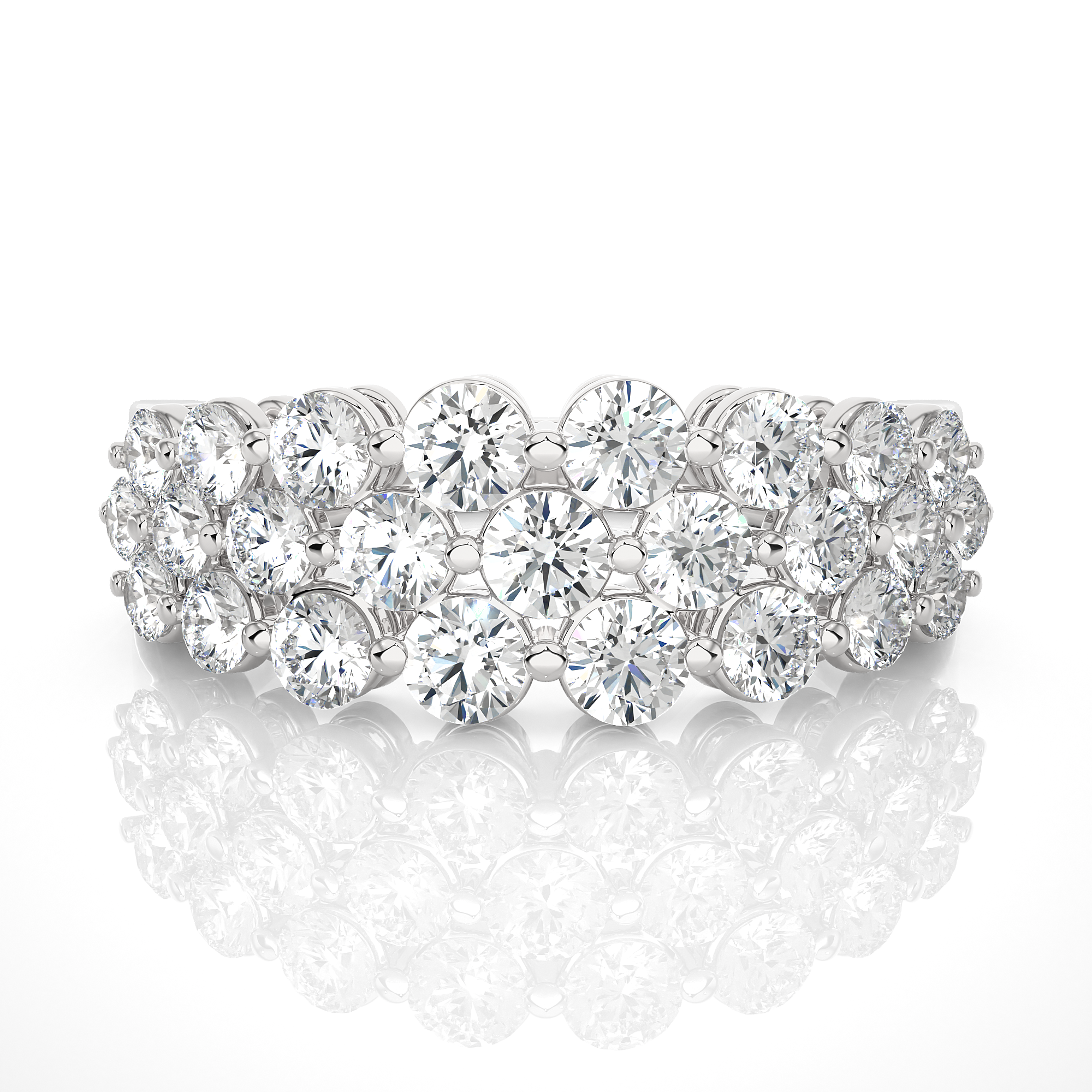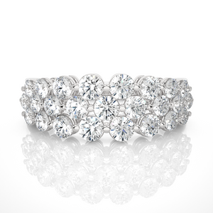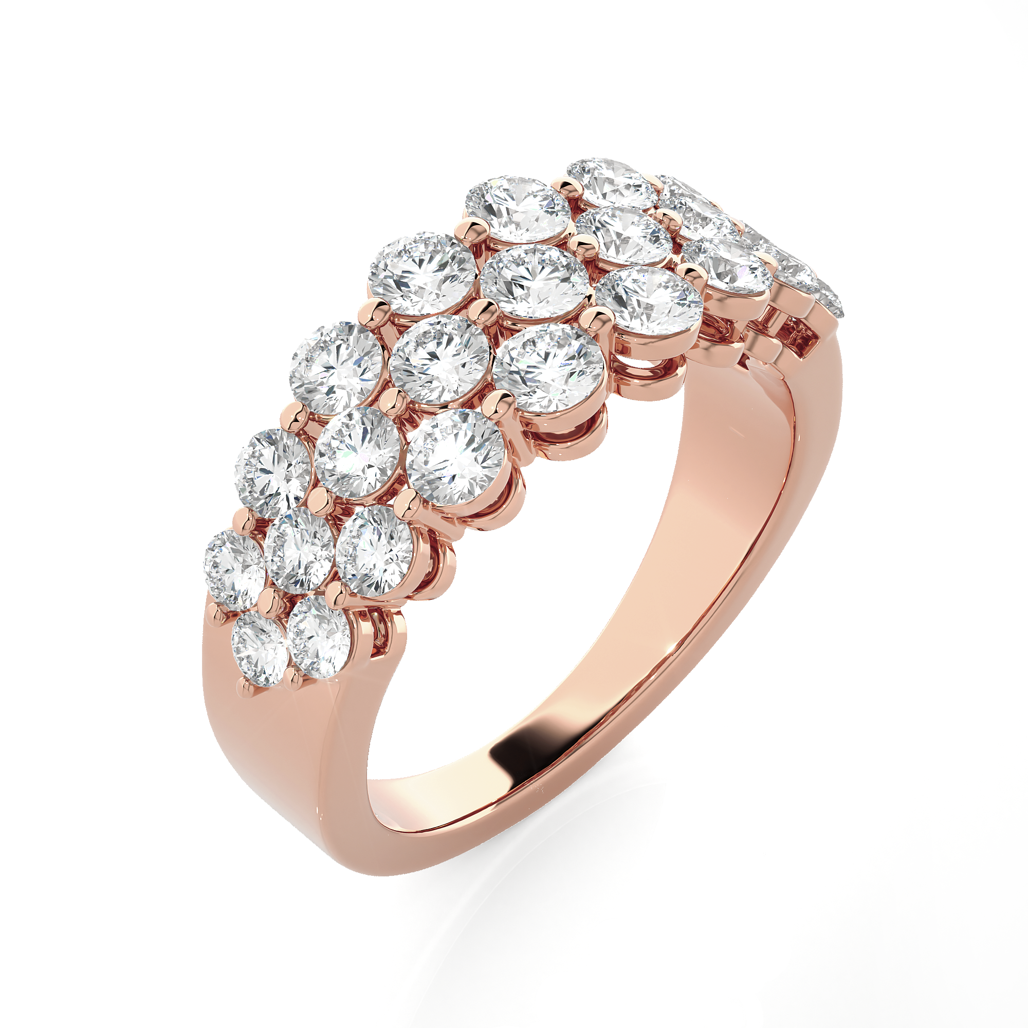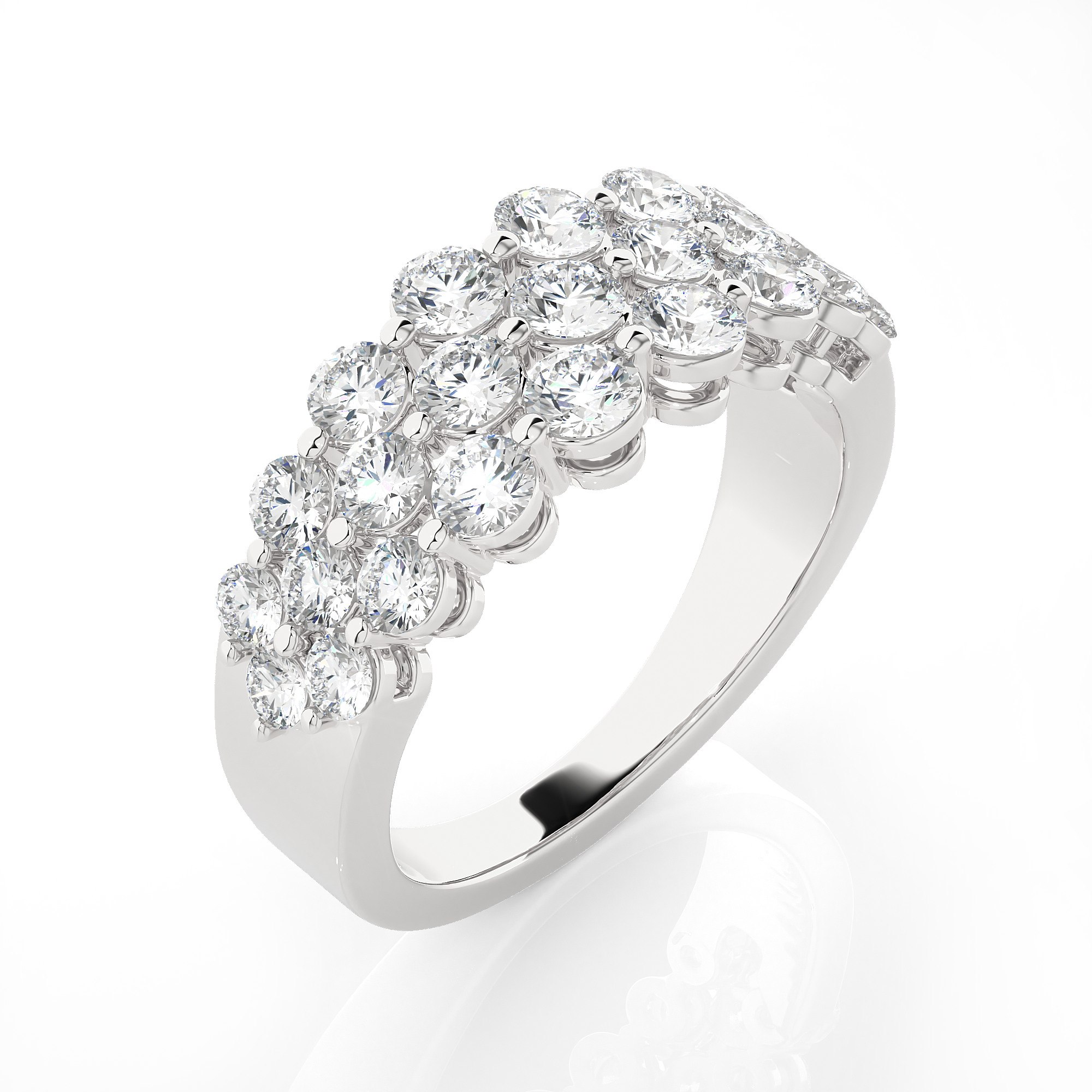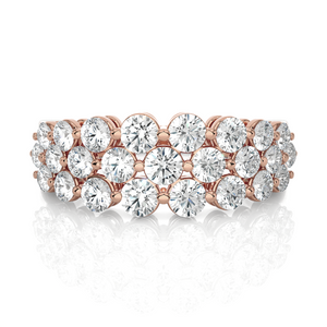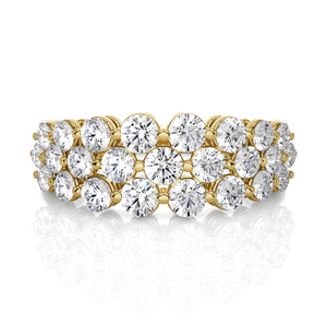 Add elegance and a romantic touch with this brightly polished 14k gold diamond anniversary ring. Three rows of round brilliant cut diamonds secured in two-prong shared settings in a raised basket add dimension to this diamond ring. Complement your bridal ring set with this diamond band, or wear it solo on any finger.