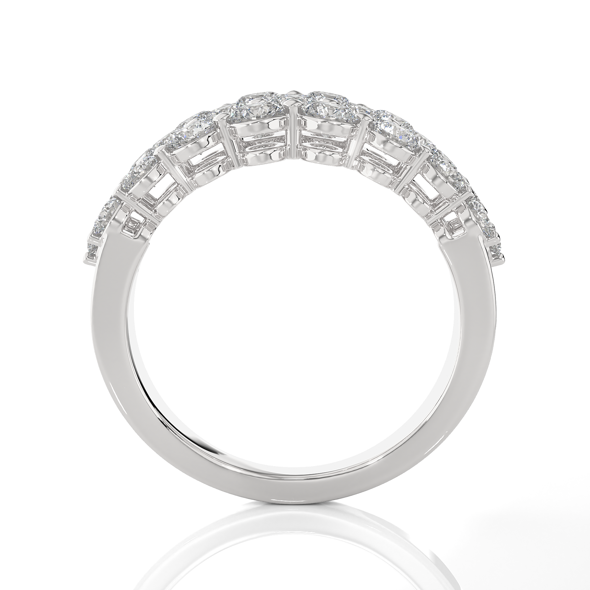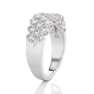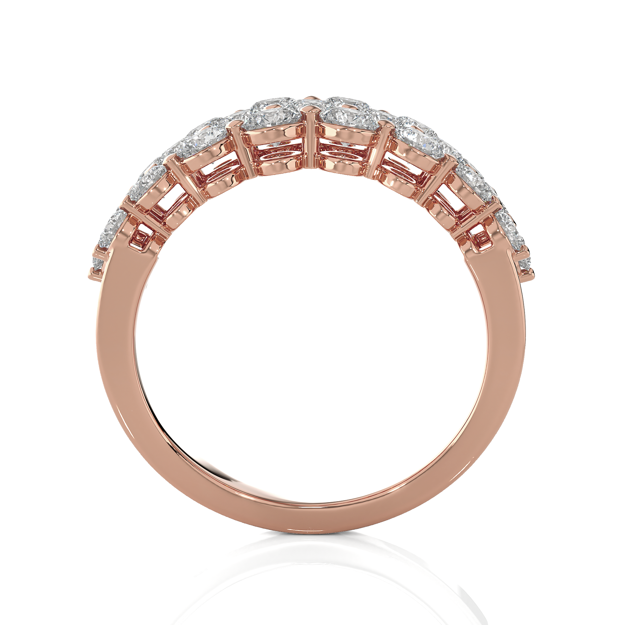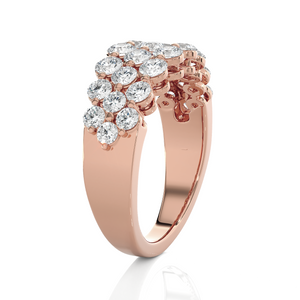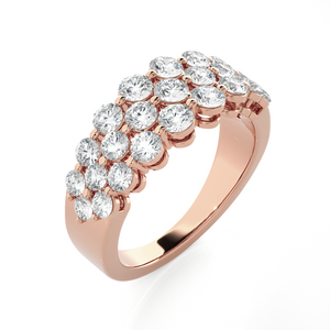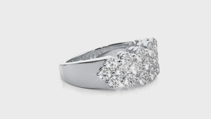 Add elegance and a romantic touch with this brightly polished 14k gold diamond anniversary ring. Three rows of round brilliant cut diamonds secured in two-prong shared settings in a raised basket add dimension to this diamond ring. Complement your bridal ring set with this diamond band, or wear it solo on any finger.