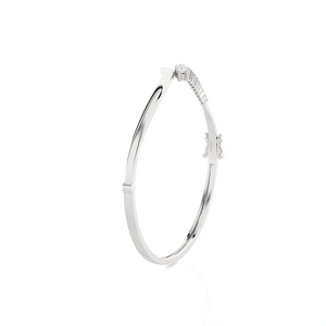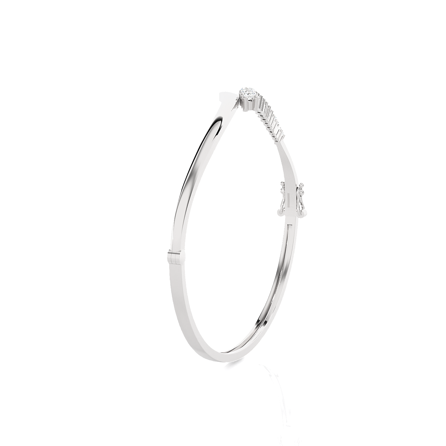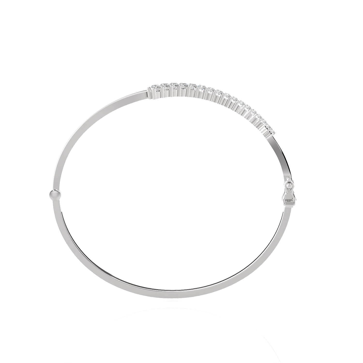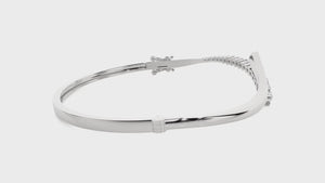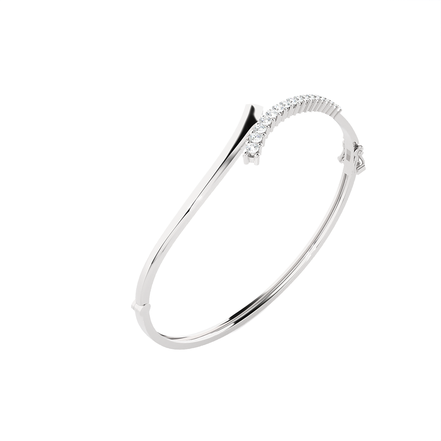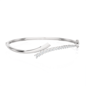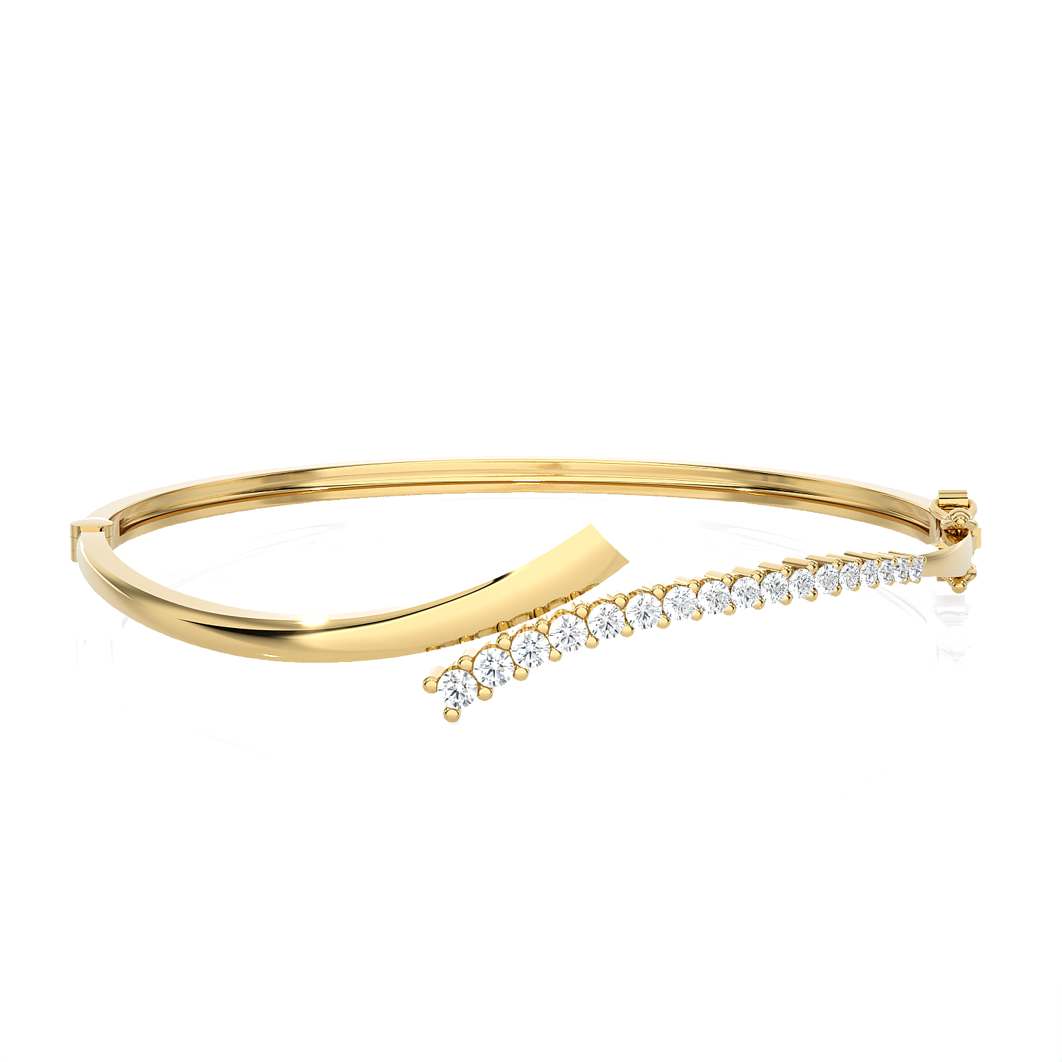 This brightly polished 14k gold diamond bangle bracelet is perfect for celebrating your next anniversary or birthday occasion; delicate lines make it suitable for wearing day to night. A hinge on one side makes this diamond bracelet effortless to remove on and off the wrist. Sparkling round brilliant cut diamonds add glamorous asymmetry.