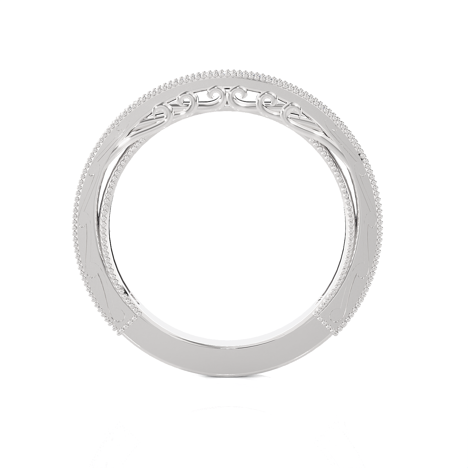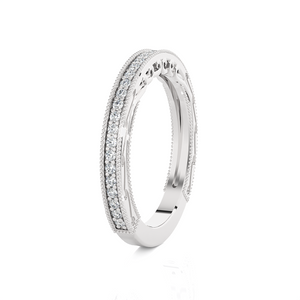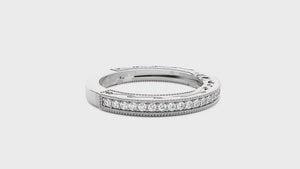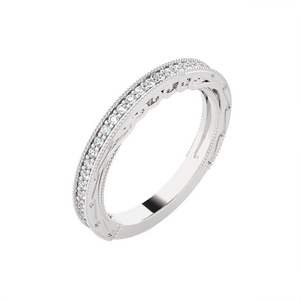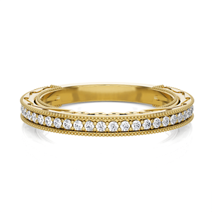 Select this stunning 14k/18k gold diamond wedding band for your next special occasion, featuring round brilliant cut diamonds channel prong set in a three-quarter eternity. Milgrain beaded edges lend a vintage inspiration, highlighted by the bright shine of the gold. Wear this versatile ring with engagement rings, stack it with fine bands, or solo.