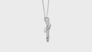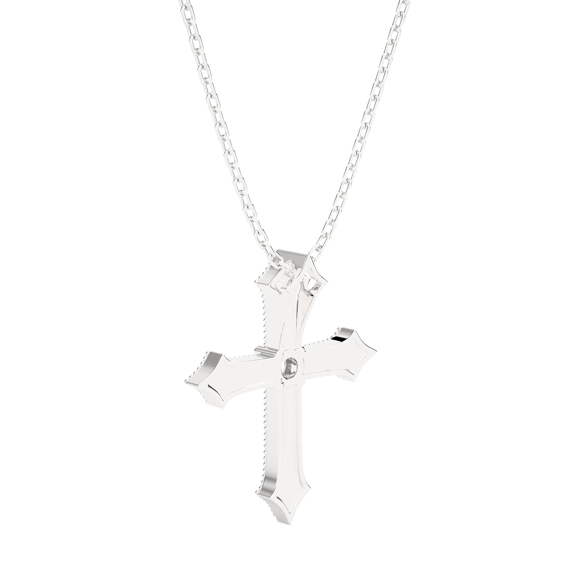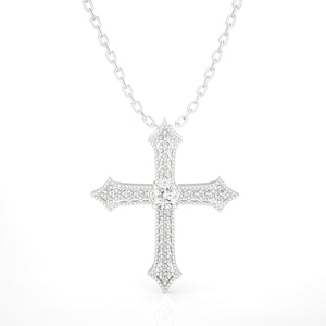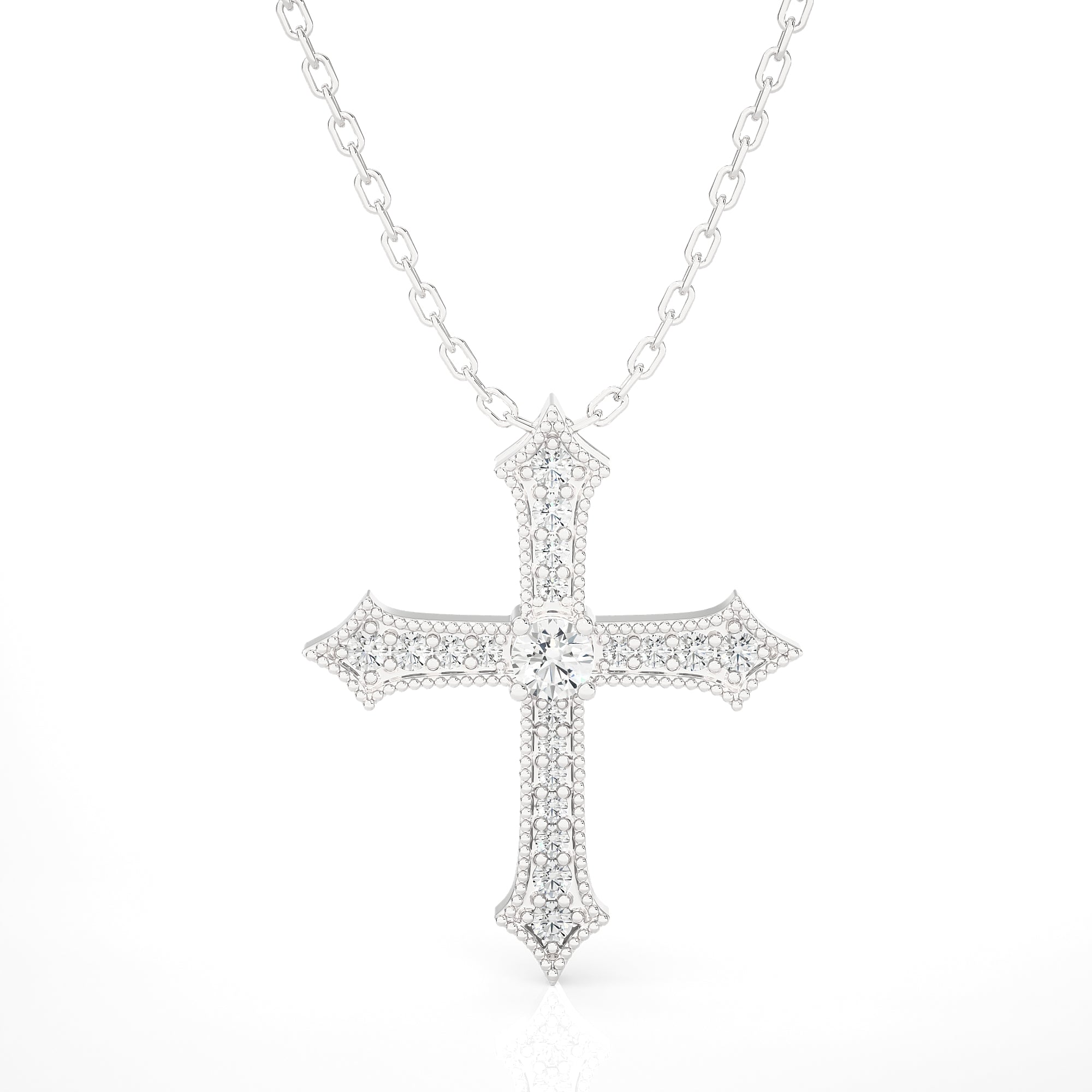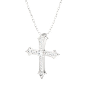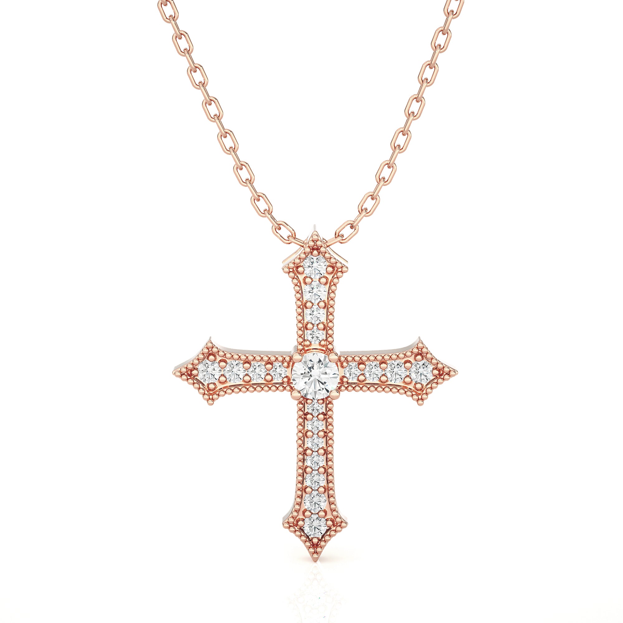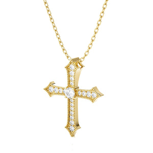 This exquisite 14k/18k gold Cross necklace showcases a round brilliant cut diamond solitaire secured in a four-prong setting in the center. Additional round brilliant cut diamonds channel-prong set on the front elevate it to another level of luxury. Milgrain beaded edges lend a vintage influence. The hidden bail on the top with a delicate cable chain threaded through gives this diamond Cross the illusion it is floating.