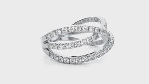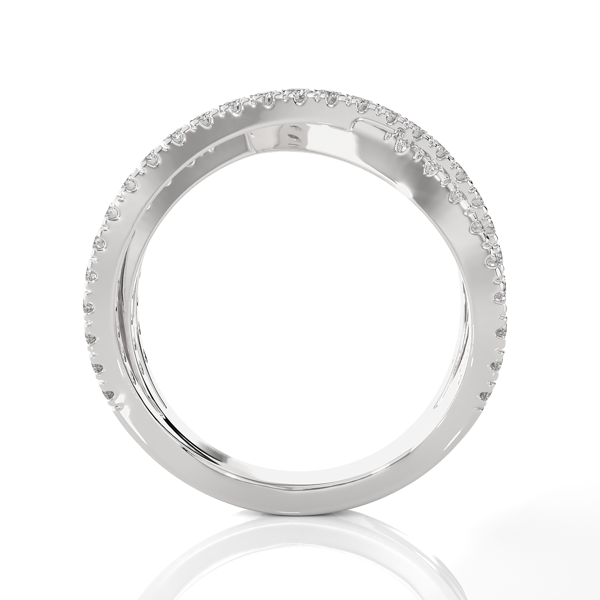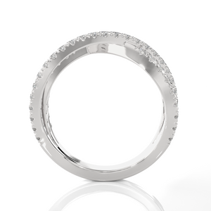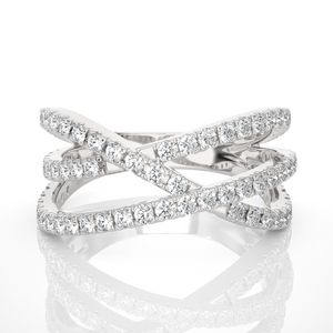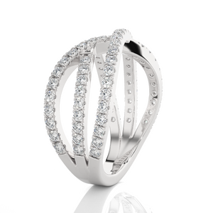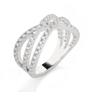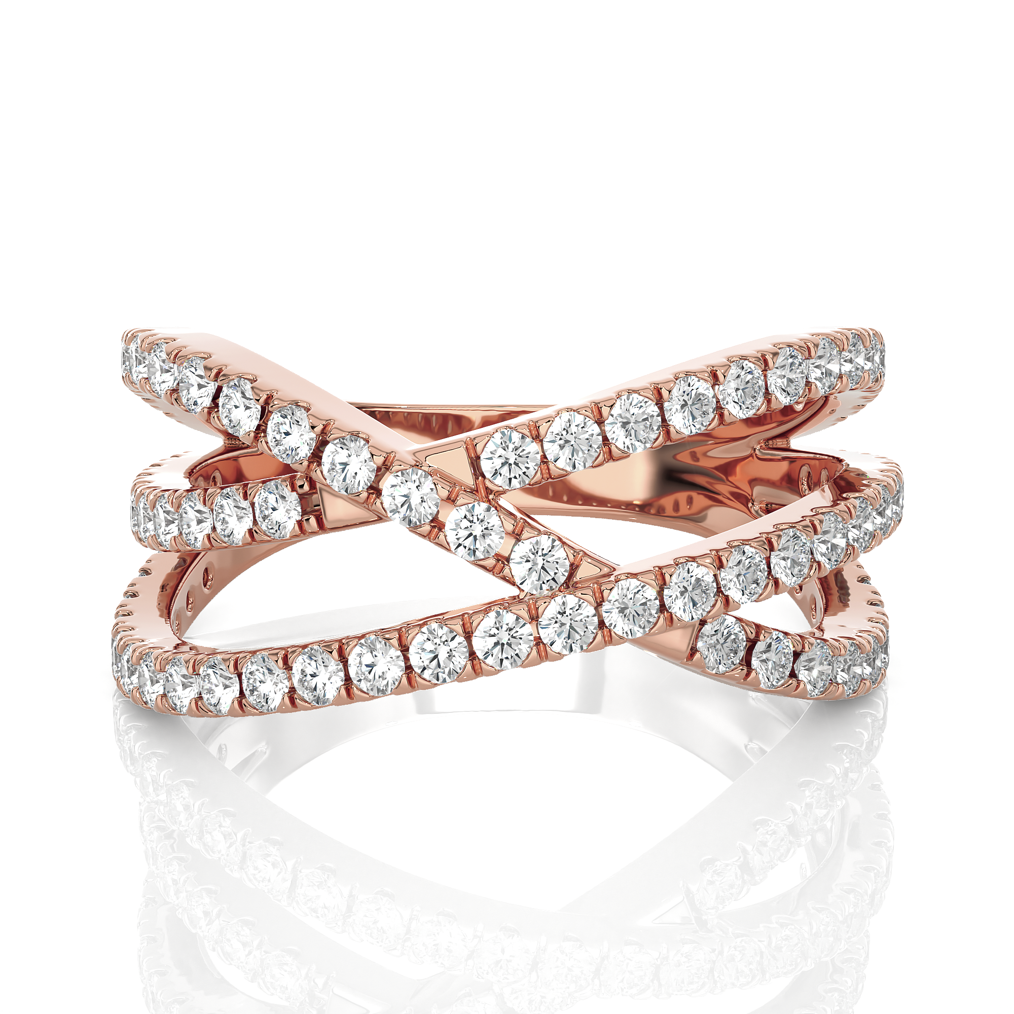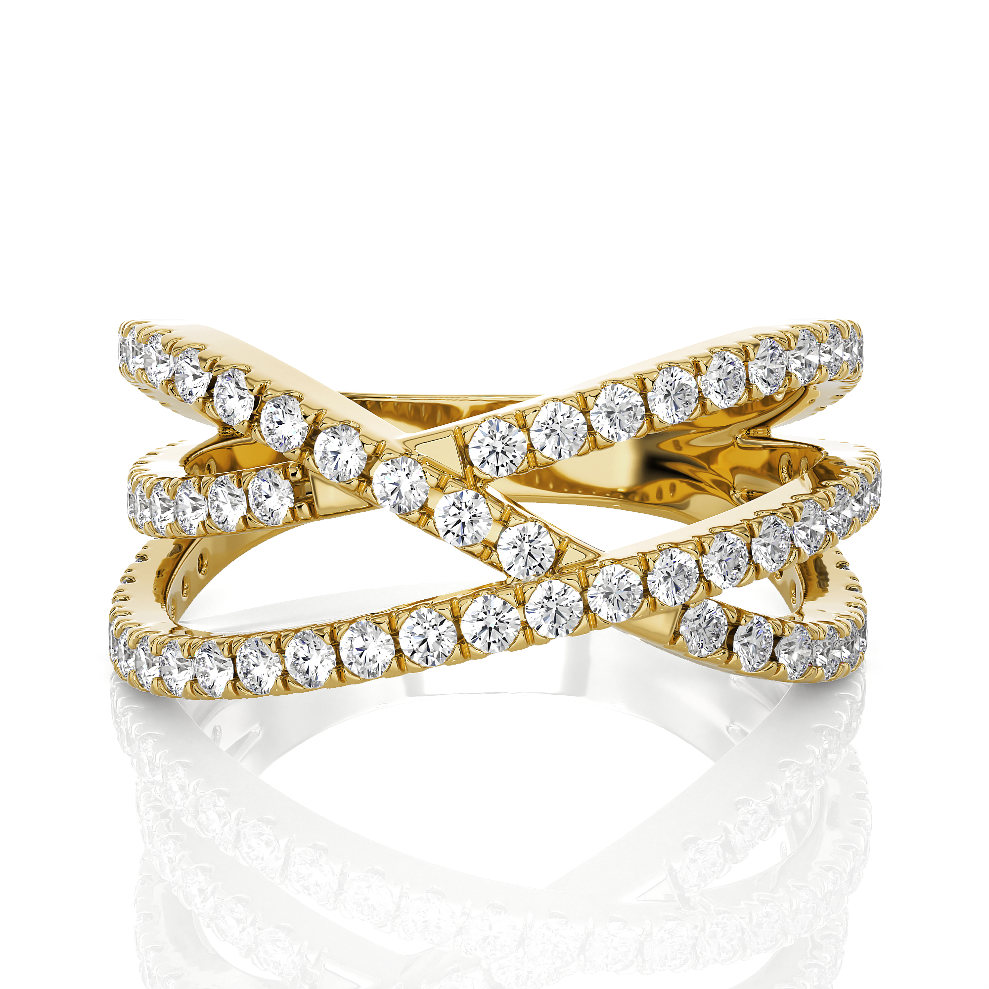 This beautiful 14k/18k gold diamond stack ring features three rows of round brilliant cut diamonds pave-prong set across the top in a dazzling criss-cross with open spaces. The flattened-shaped shank lends comfort to this modern diamond ring, as it allows the diamonds to showcase their endless fire. Finely crafted in a rich shine.