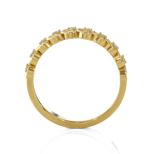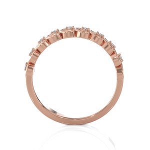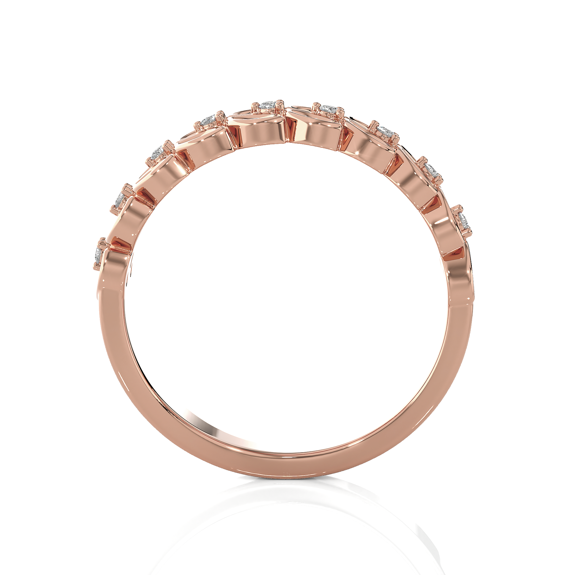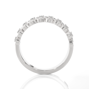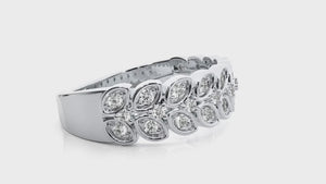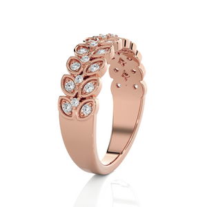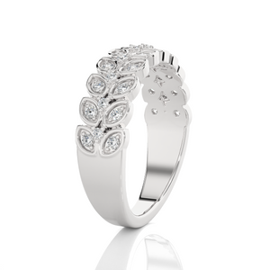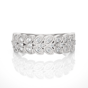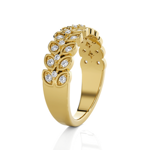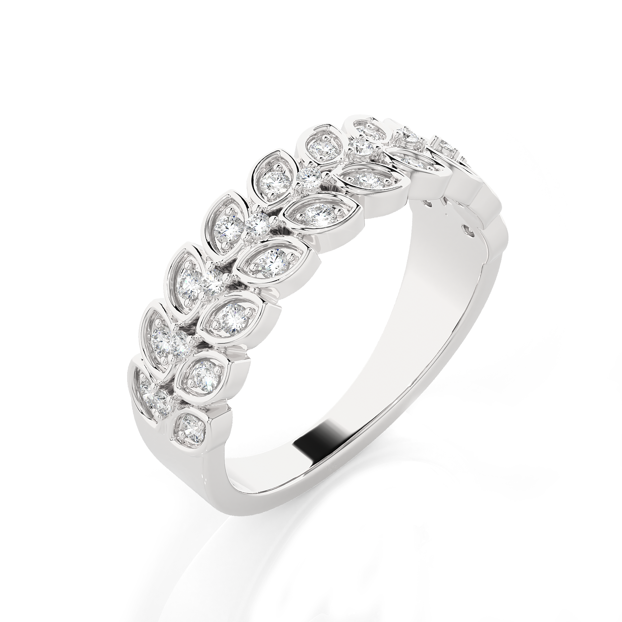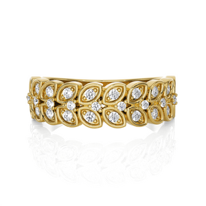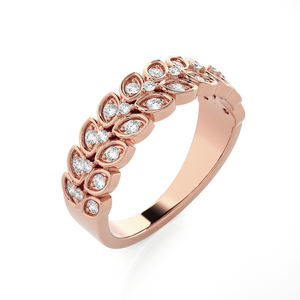 Two rows of round brilliant cut diamonds nestle in two-prong settings, giving this enchanting 14k gold diamond anniversary ring an exquisite style. Repeating leaves create a fanciful laurel wreath, all set on a tapered band with flat edges. Select something luxe for any moment– perfect for your next anniversary, stacking ring, or diamond wedding ring choice.