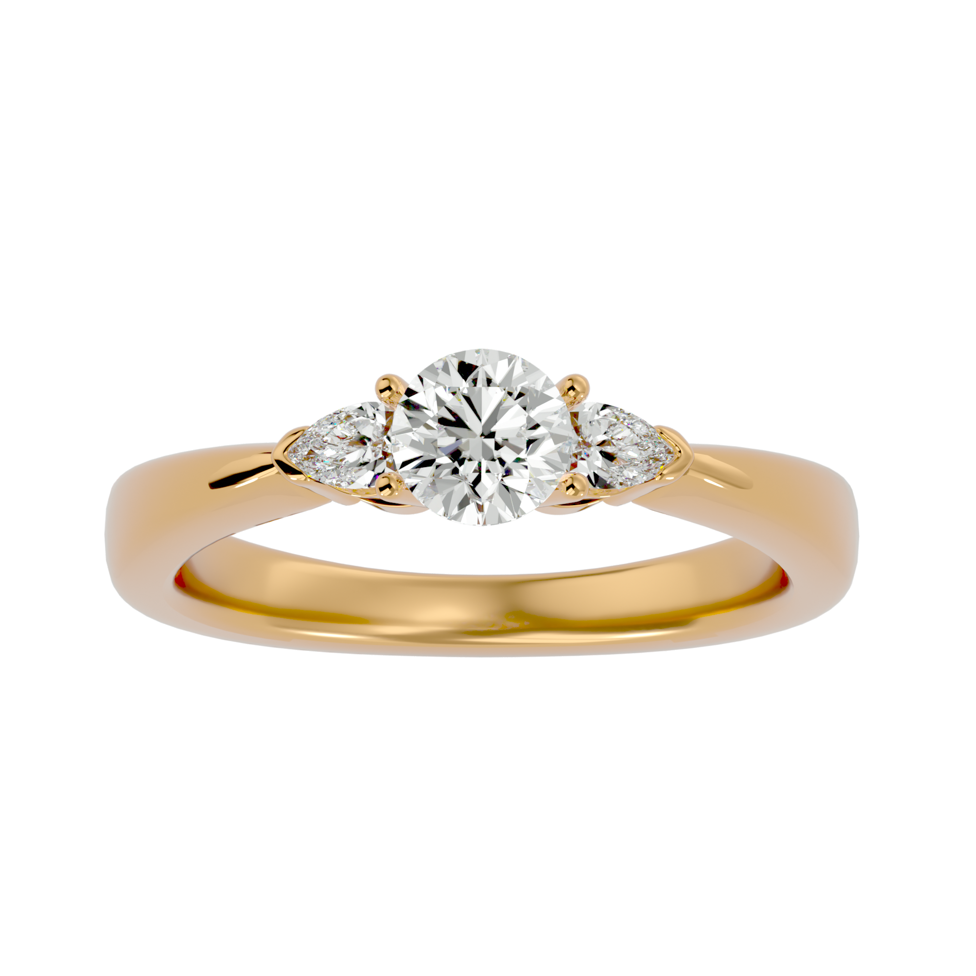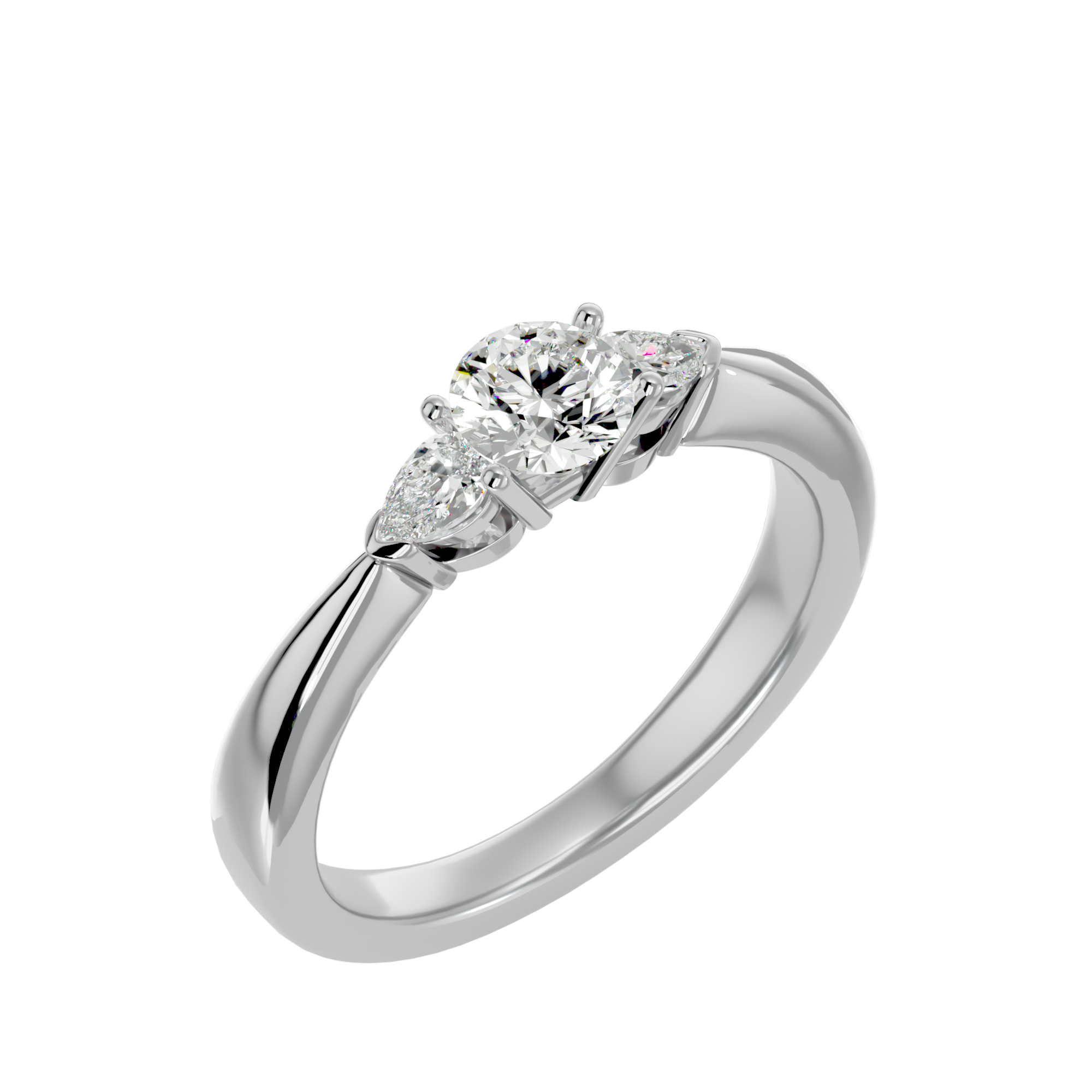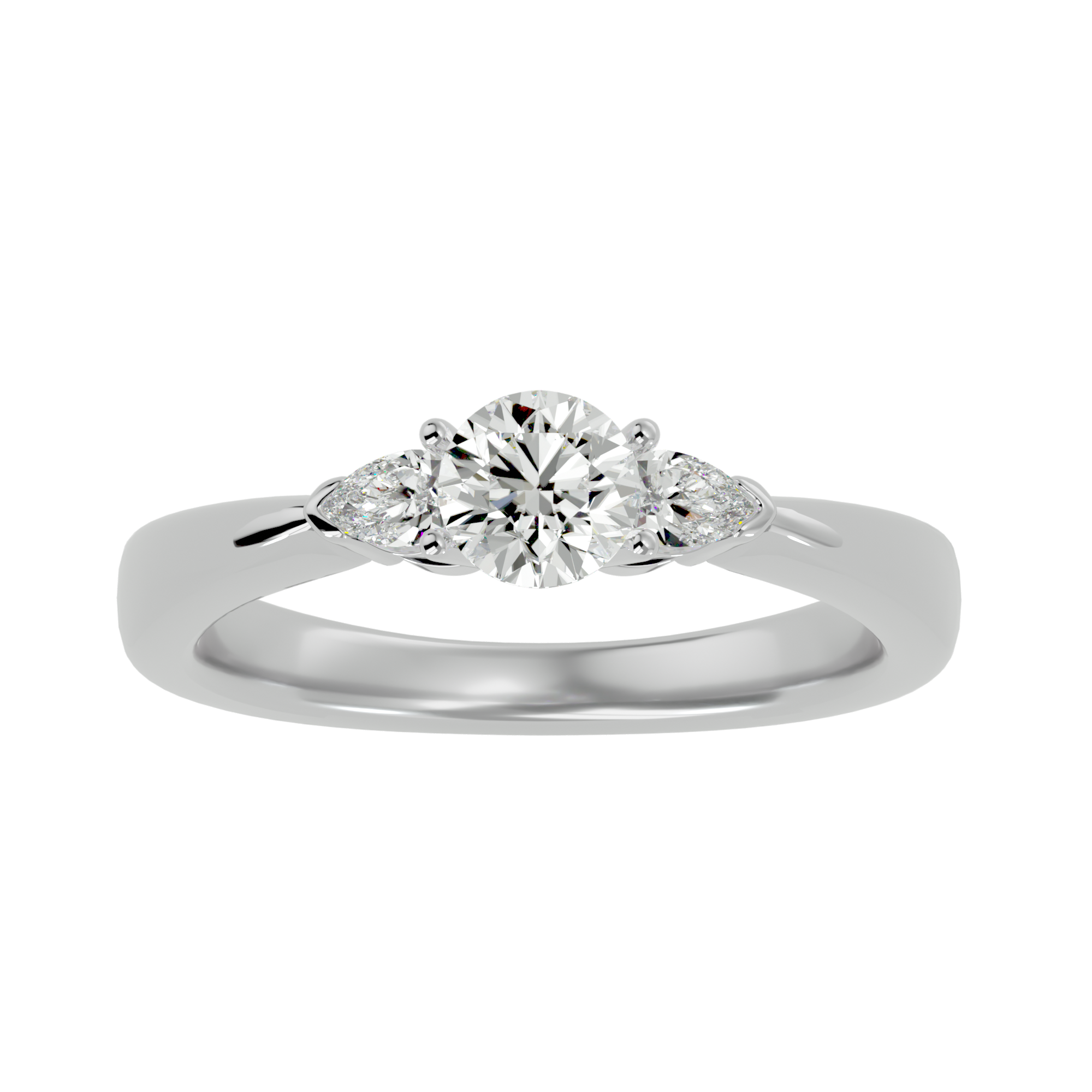 With this past, present and future setting, you can?? go wrong. A vintage inspired three stone styling, has a beautifully crafted center diamond taking prominence, flanked by comparatively smaller lab grown diamonds on the sides in the classic pear shape, creating a snug look, a popular wedding and anniversary option. Customize them in white, yellow or rose gold.