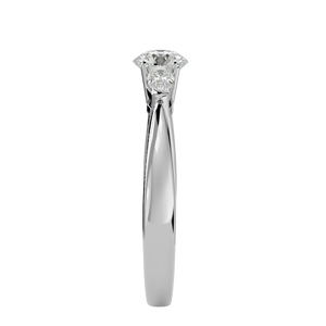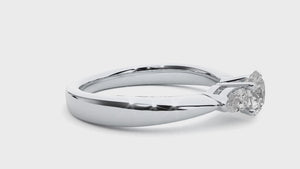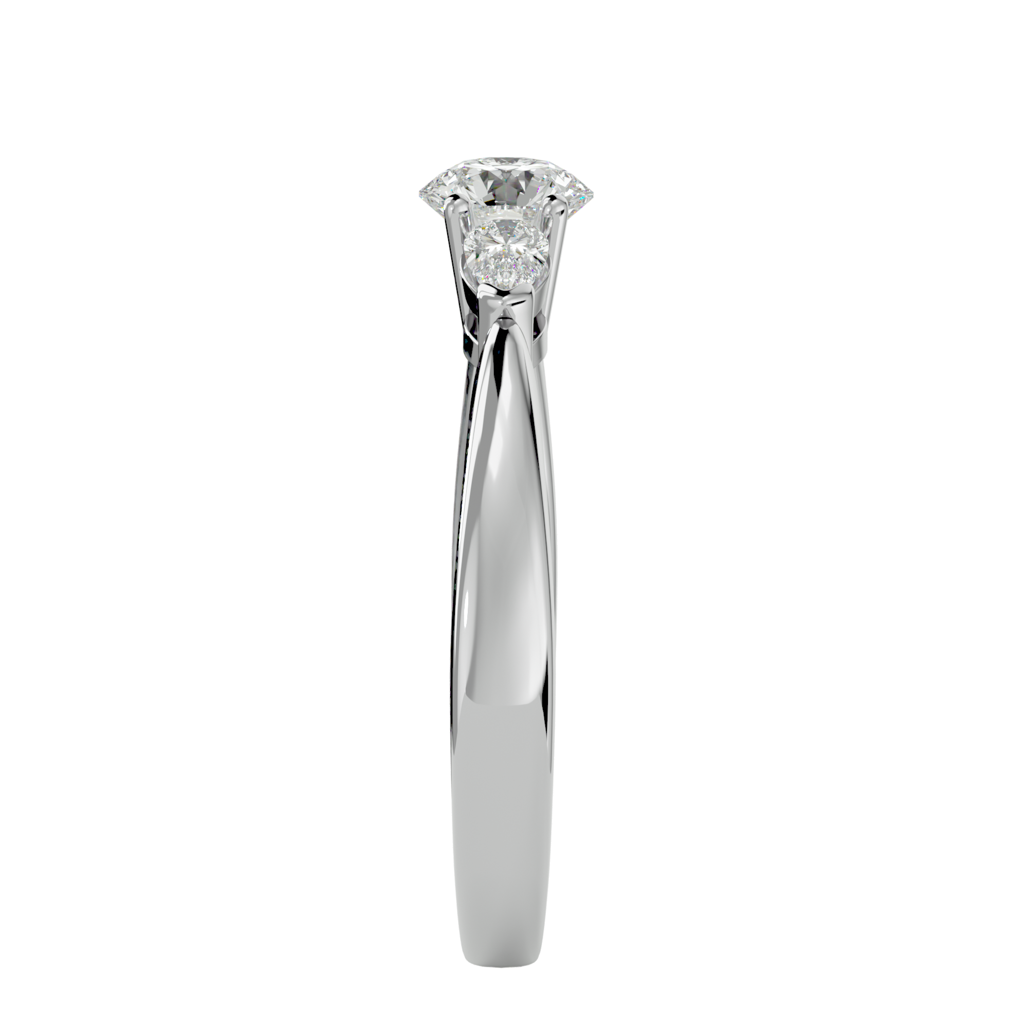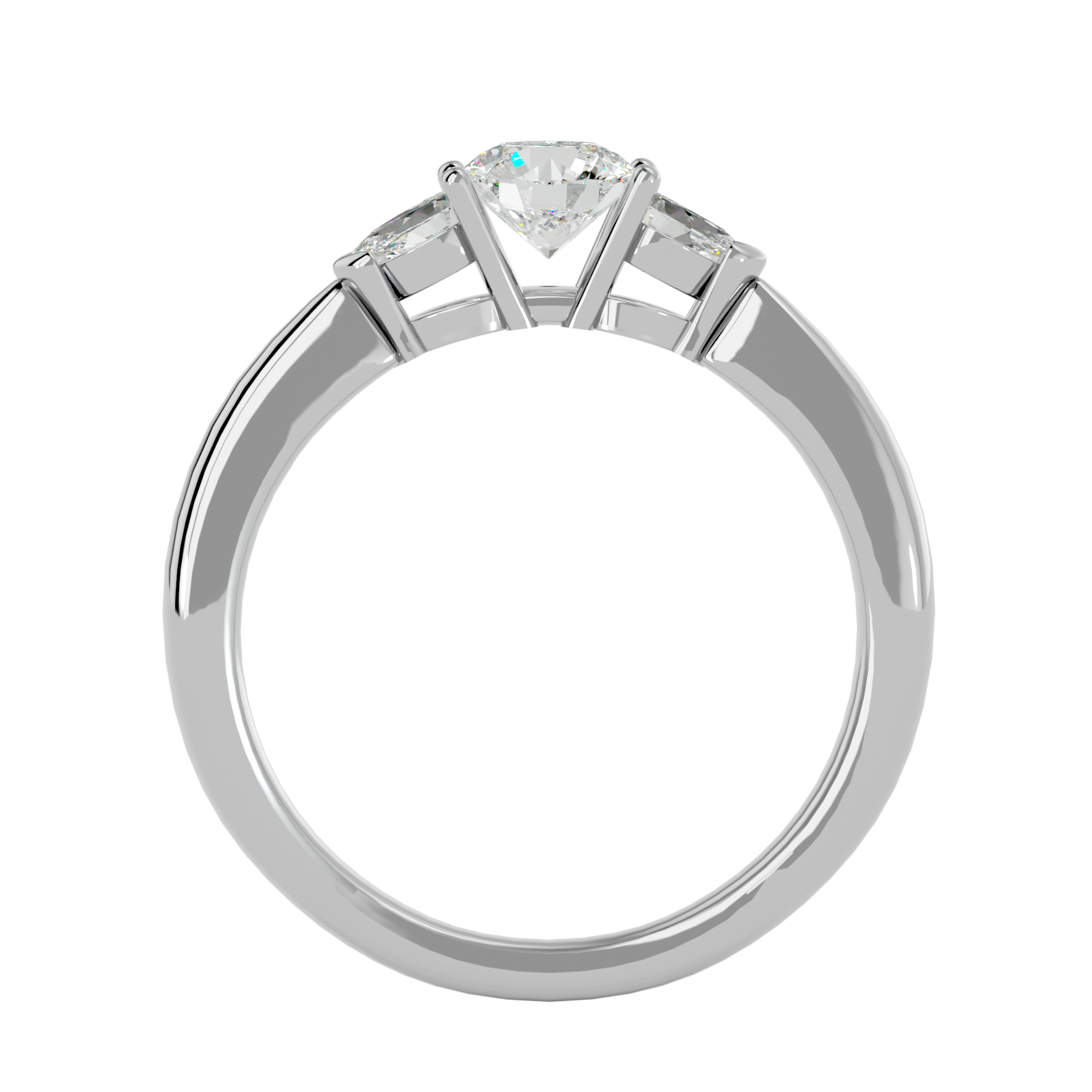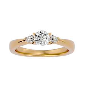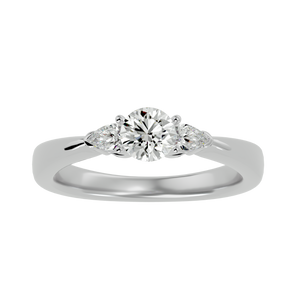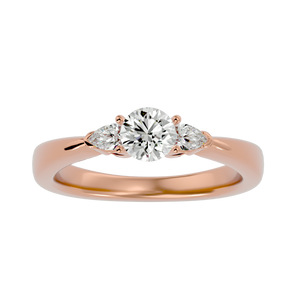 With this past, present and future setting, you can?? go wrong. A vintage inspired three stone styling, has a beautifully crafted center diamond taking prominence, flanked by comparatively smaller lab grown diamonds on the sides in the classic pear shape, creating a snug look, a popular wedding and anniversary option. Customize them in white, yellow or rose gold.