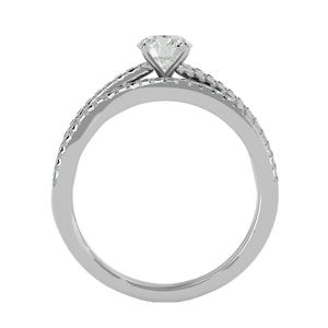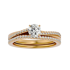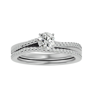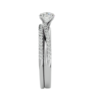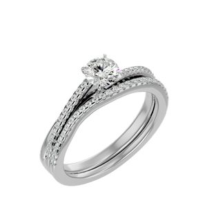 A fashionable style of a solitaire set into a twin ring setting that accentuates the center round diamond, and is marked with comparatively smaller lab grown diamond set in the channel setting all around the rings, with a marked eternity curve across the ring. A great choice for a bridal set. Can be customized as stacking rings as well.