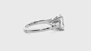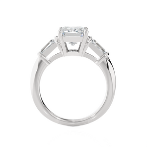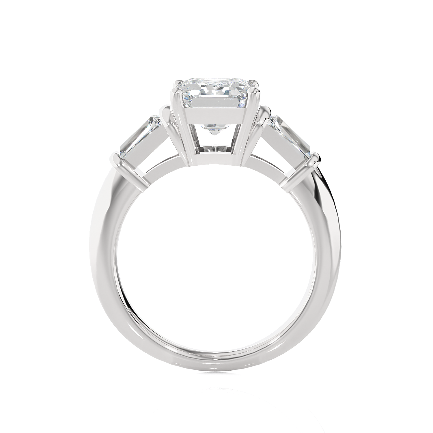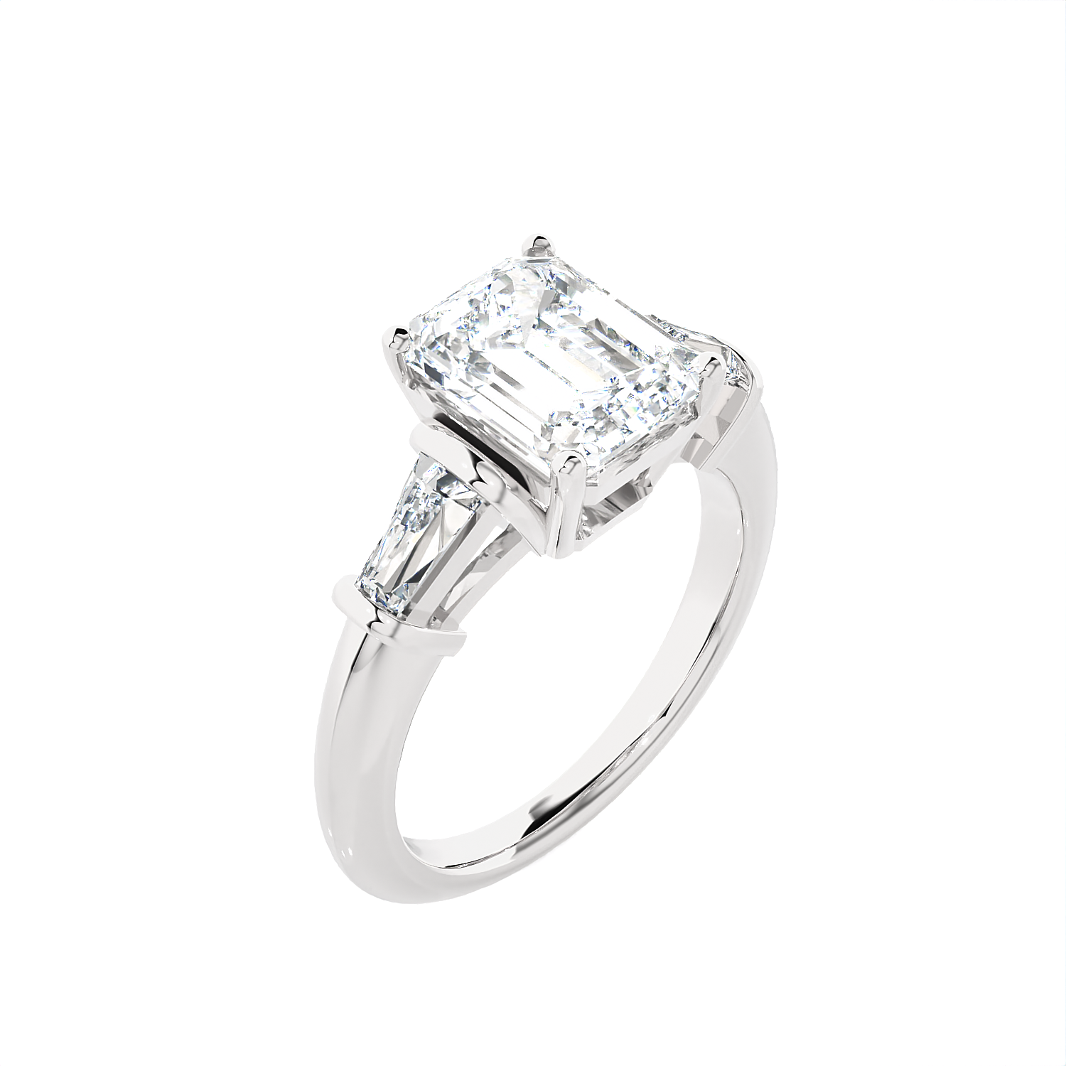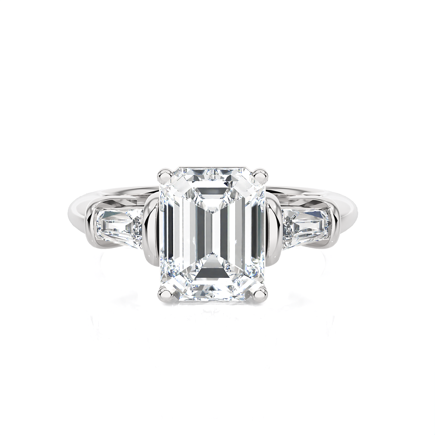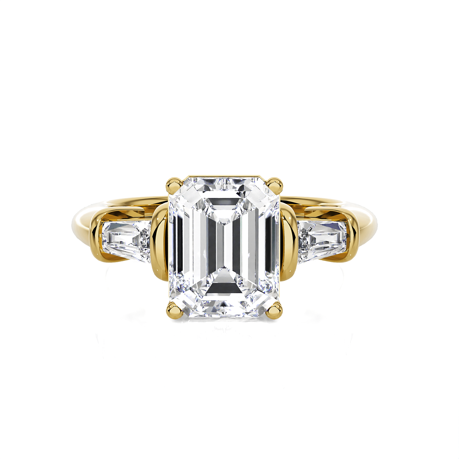 Select this modern 14k /18K gold engagement ring with its sleek lines and simple silhouette, creating a stunning appearance as it sits elegantly on the finger. An emerald-cut lab-grown diamond solitaire sits in a four-prong setting in the center. Custom-cut tapered baguette diamonds on each side add glamor in an east-west channel bar setting, with all stones placed on a Cathedral mounting. A slim band on the bottom lends comfort.