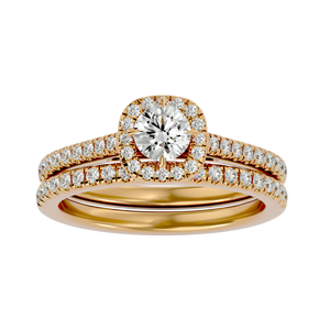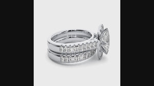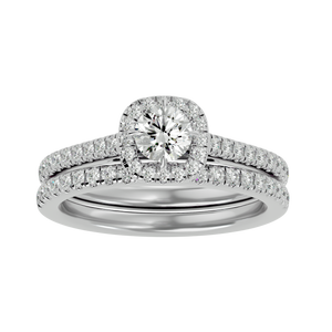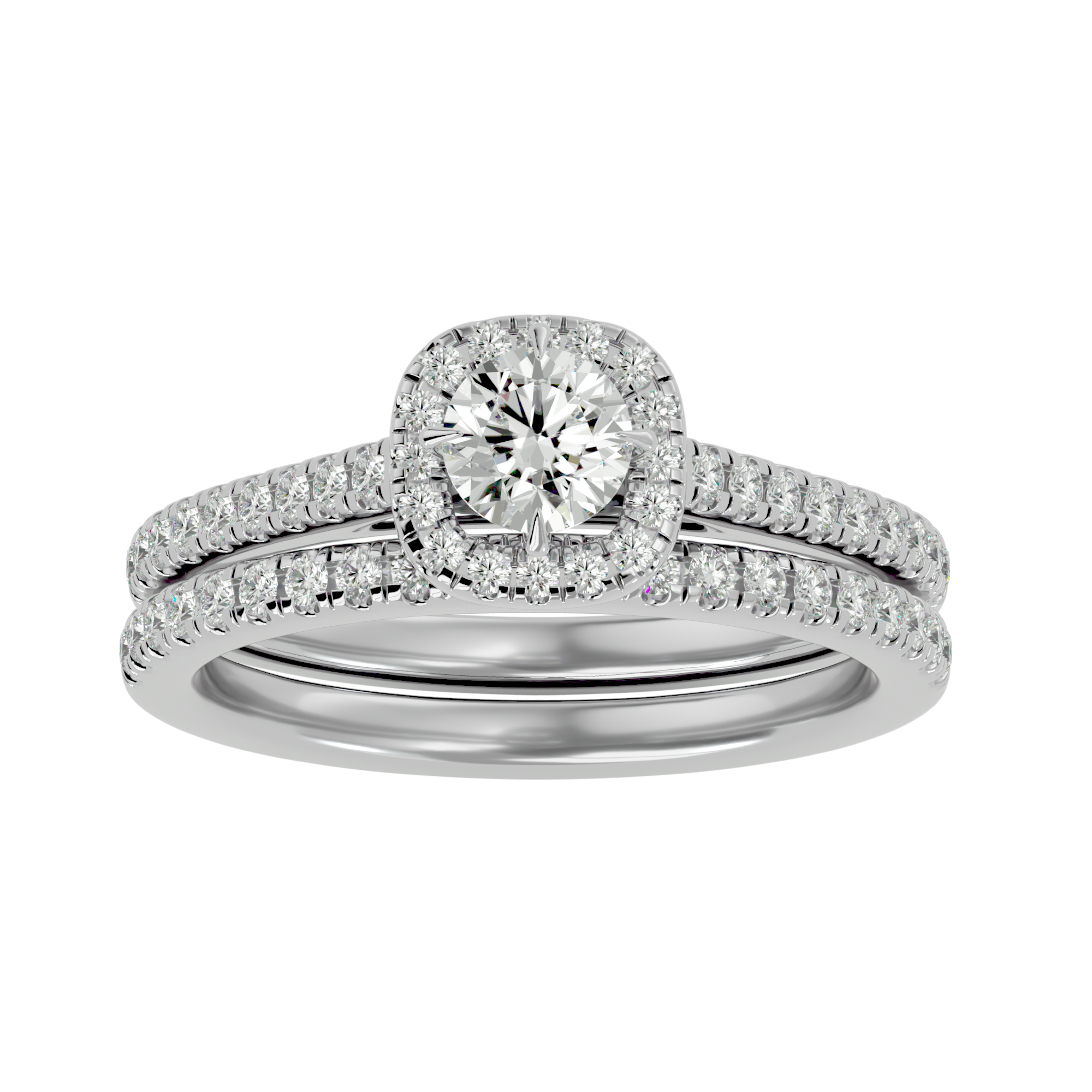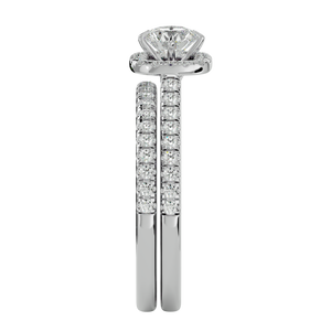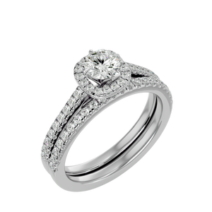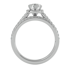 The perfect solitaire in a halo setting presents a single lab grown diamond in the center encircled by asymmetric smaller diamonds that enhance the sheen of the ring, further marked by two rows of smaller stones in a three fourth pave` array that add even more magic to this perfect bridal set.