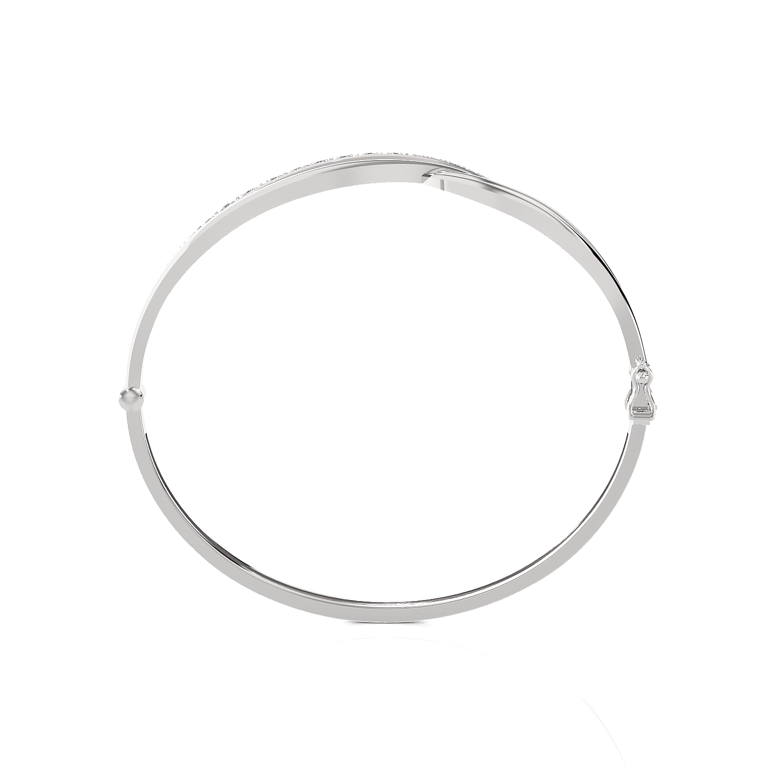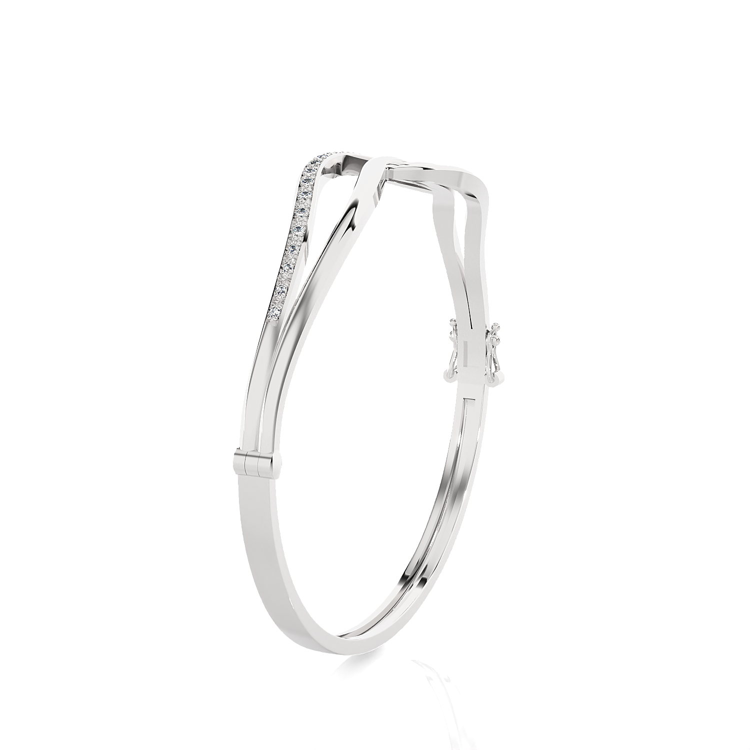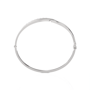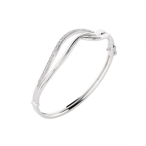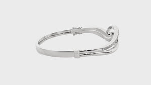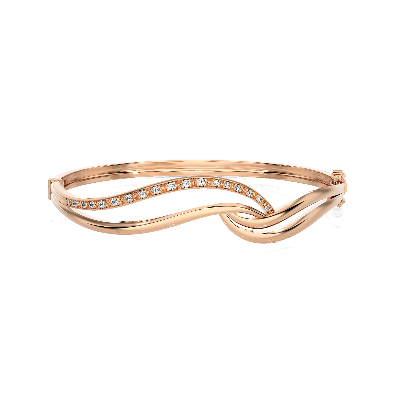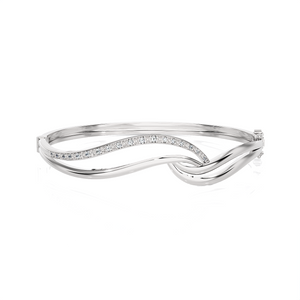 Glittering round brilliant cut diamonds pave set on this 14k/18k gold bangle bracelet amplifies its unique double wave top, highlighting its unique design with fire and shine. A hinge on one side makes this diamond bracelet effortless to remove on and off the wrist. Select this bangle for an anniversary or holiday occasion, perfect for honoring your romance with sophistication.