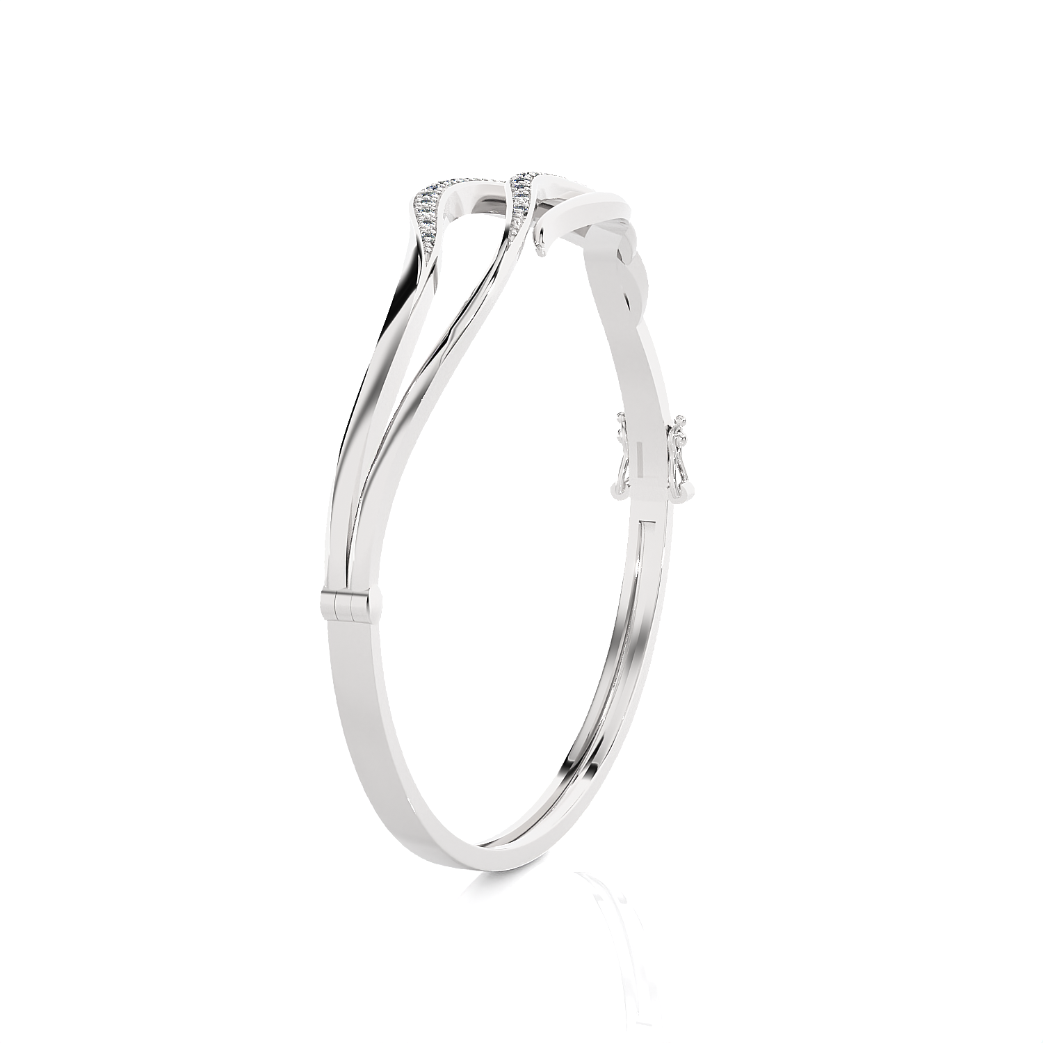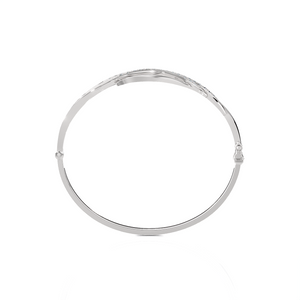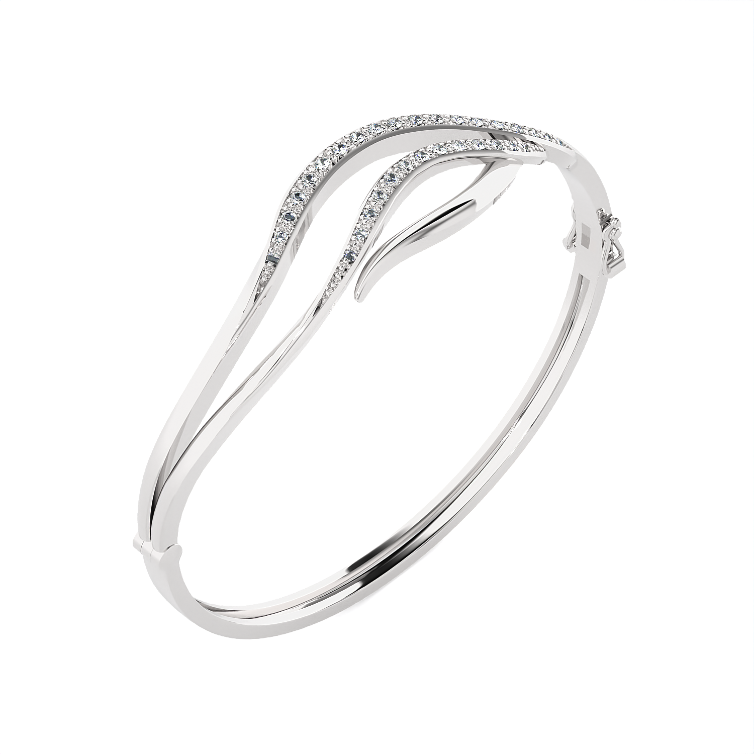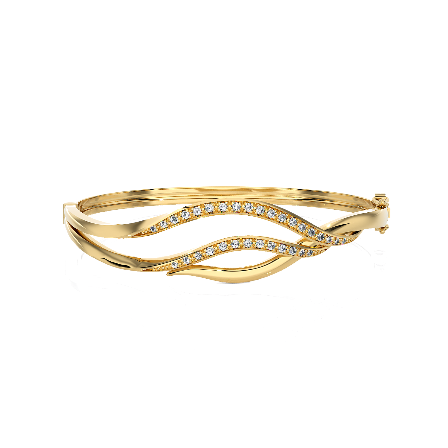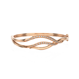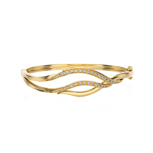 This brightly polished 14k/18k gold diamond bangle bracelet features glittering round brilliant cut diamonds pave set in multiple arcs across the top, giving it a look of inspiration artistry mingled with total luxury. A hinge on one side makes this diamond bracelet effortless to remove on and off the wrist.