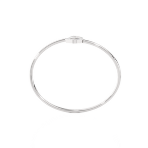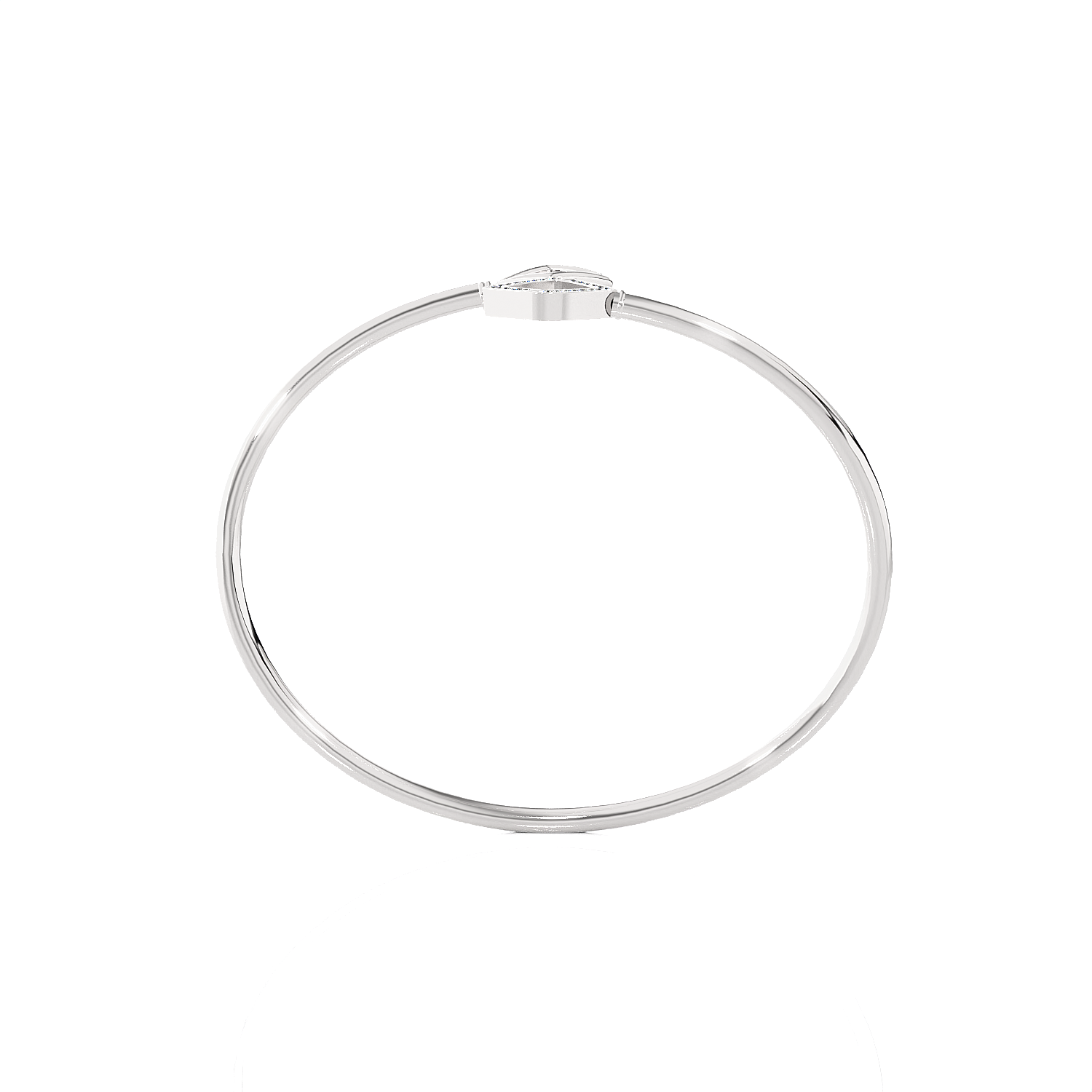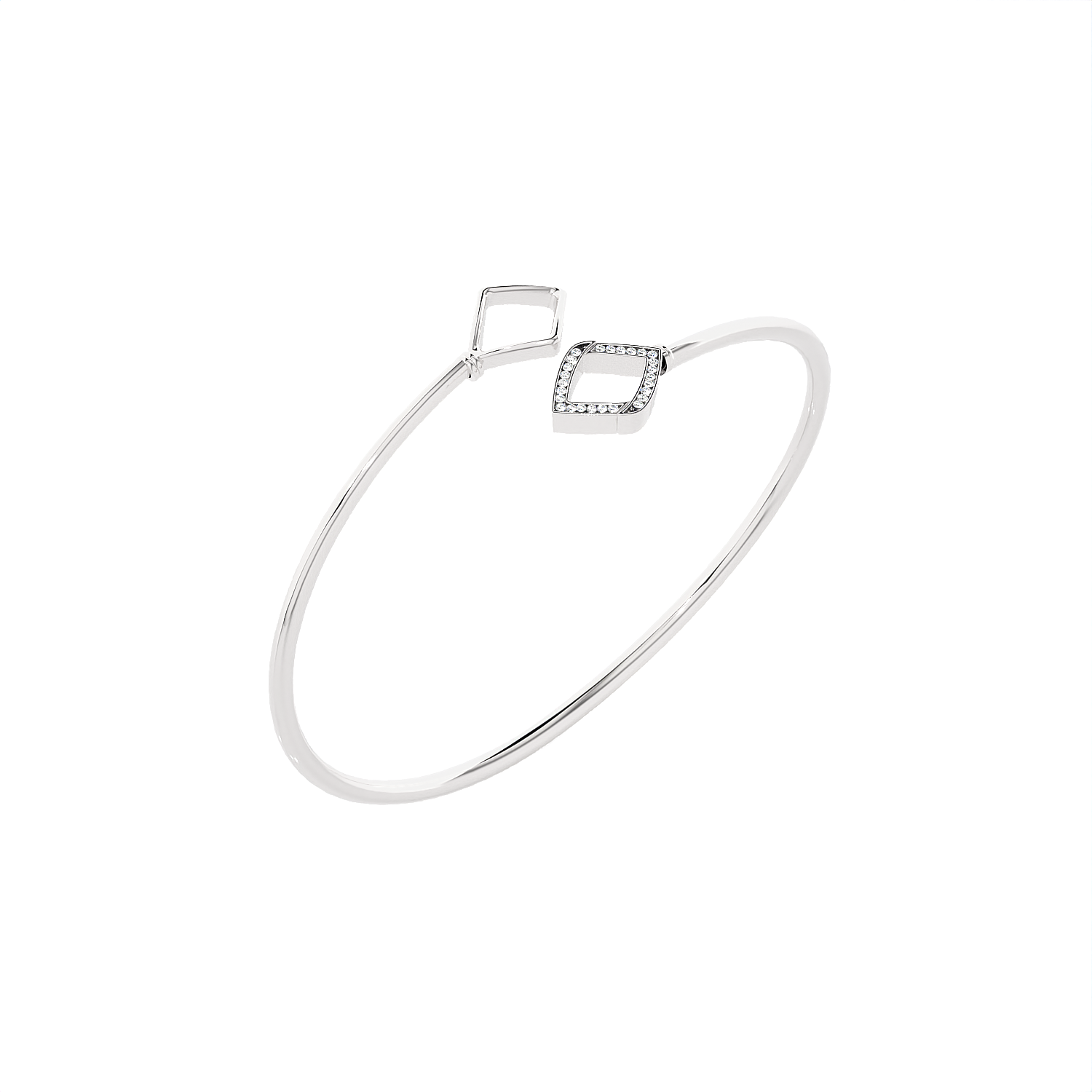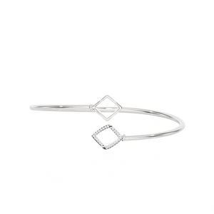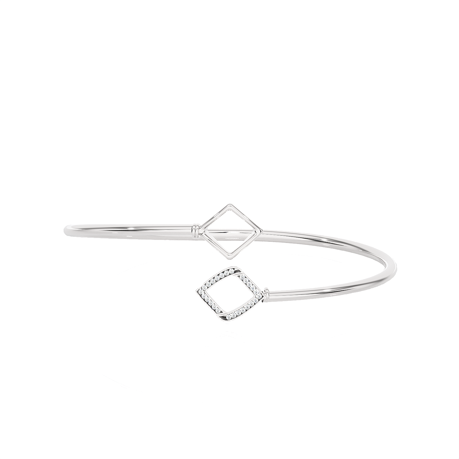 This brightly polished 14k white gold diamond open cuff bangle bracelet features glittering round brilliant cut diamonds micro pave in a striking knife edge shape, giving this bangle a unique geometry, perfect for wearing as the main attraction.