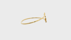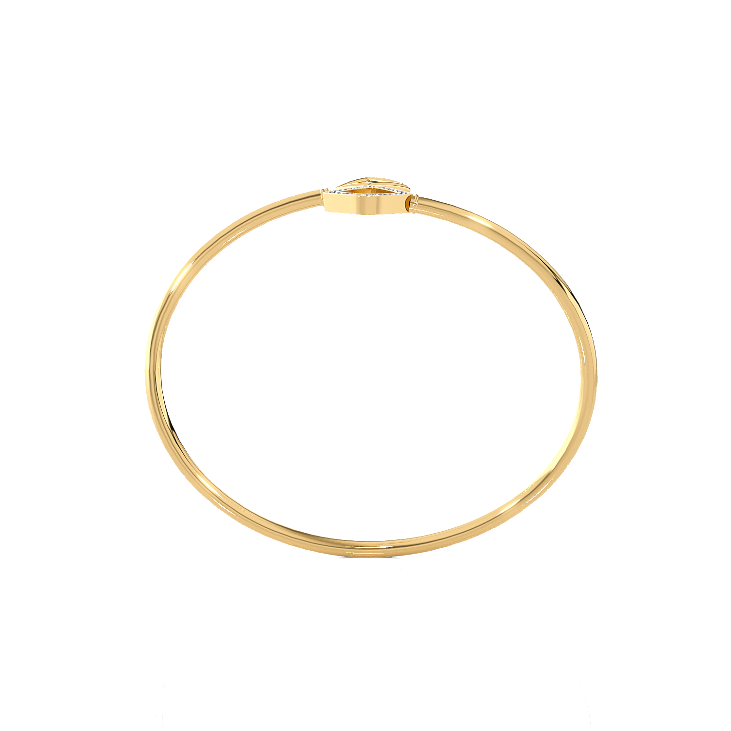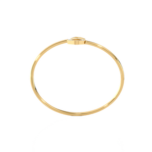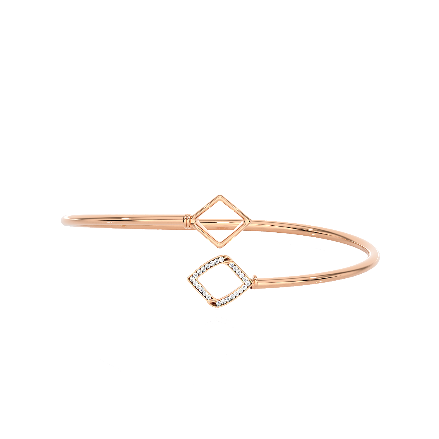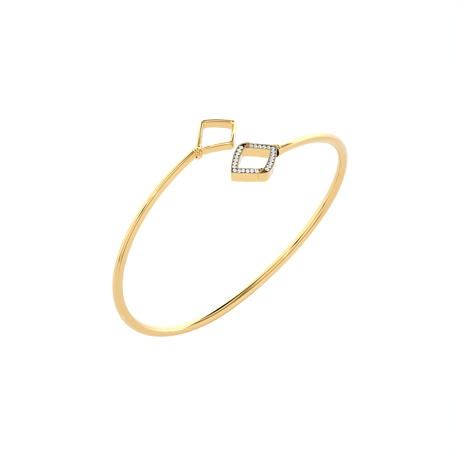 This brightly polished 14k white gold diamond open cuff bangle bracelet features glittering round brilliant cut diamonds micro pave in a striking knife edge shape, giving this bangle a unique geometry, perfect for wearing as the main attraction.