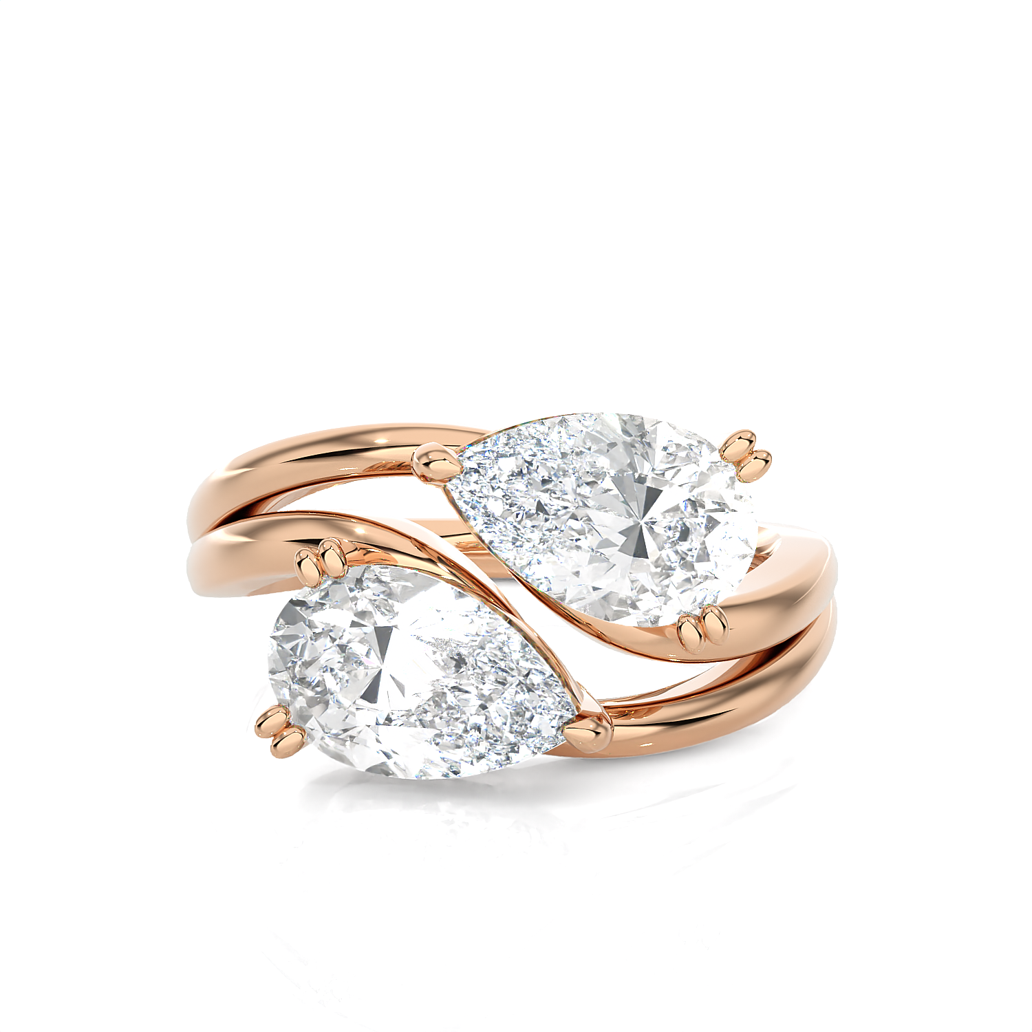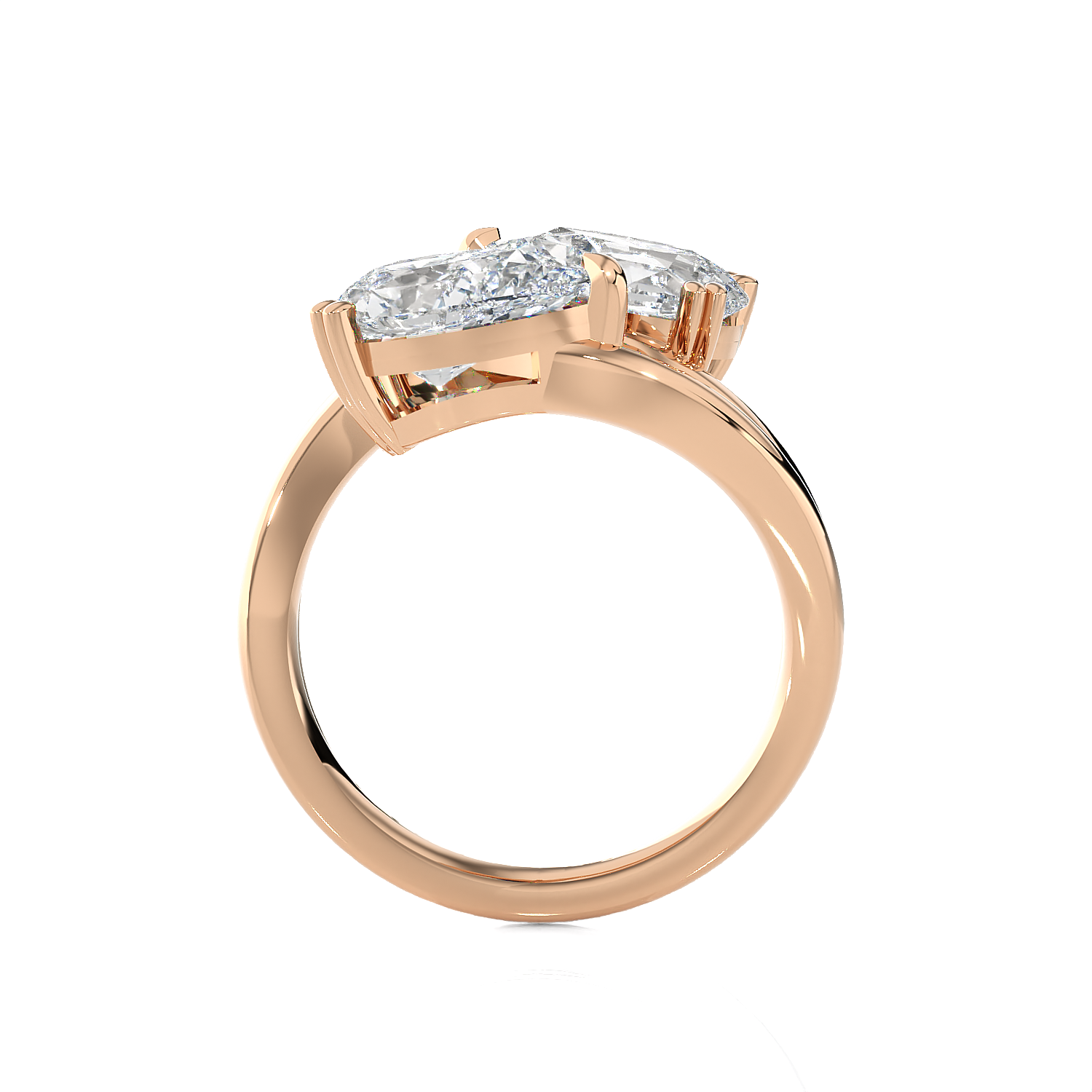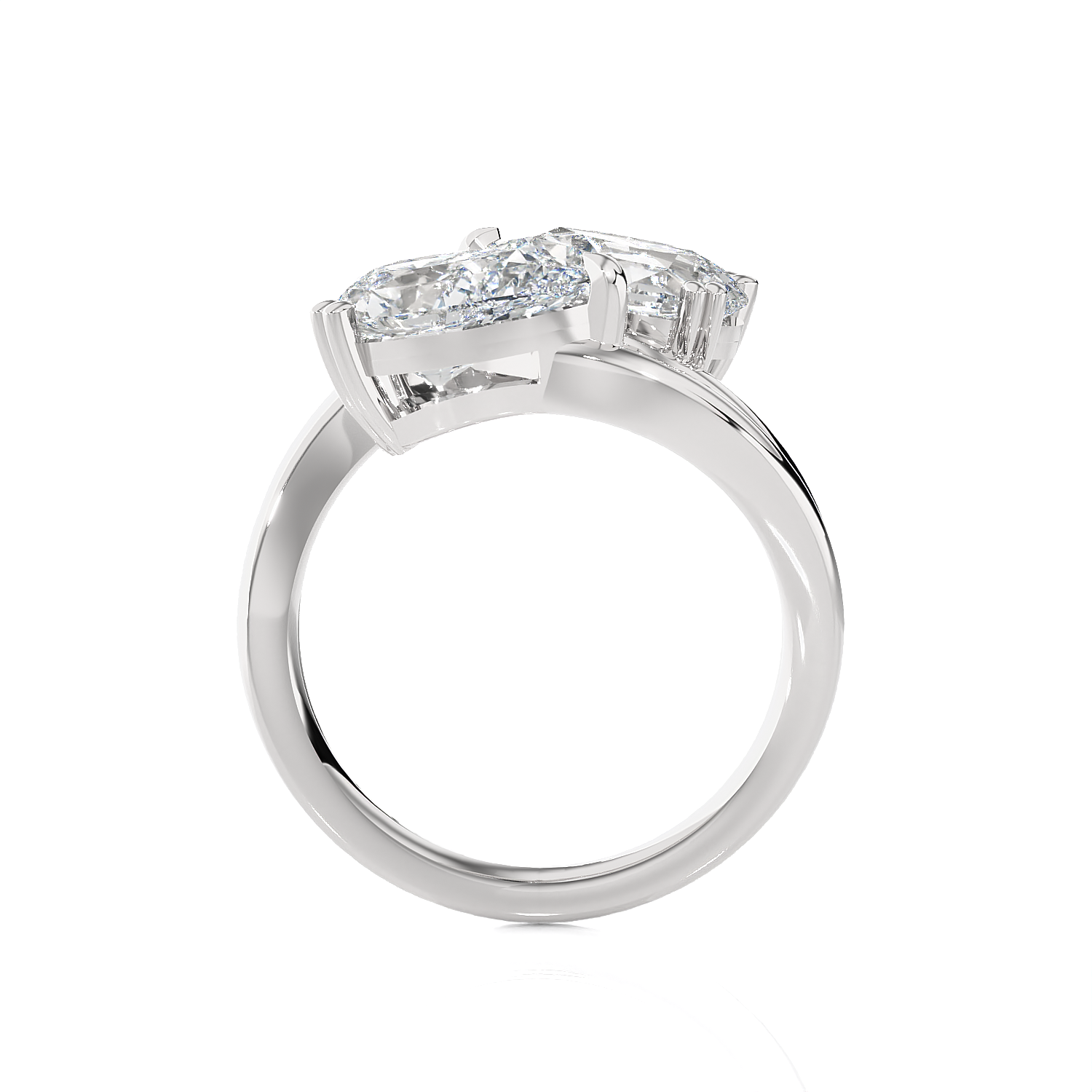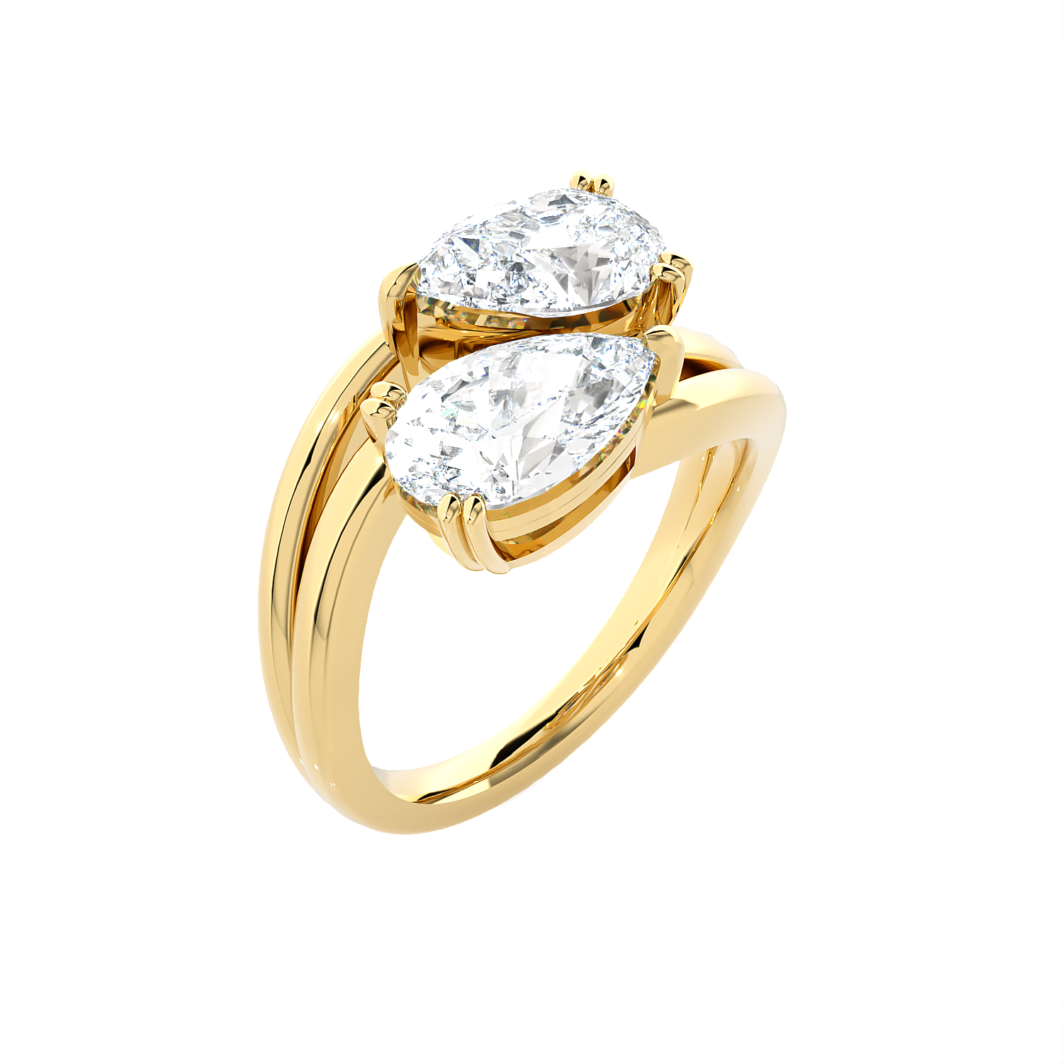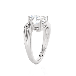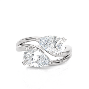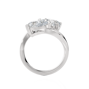 This glamorous 14k gold two-stone engagement ring features an emerald cut diamond secured in a double four-prong setting placed sideways in an east-west design. A pear-shaped diamond solitaire sits next to this diamond, creating a striking Toi et Moi engagement ring, finely crafted in a rich and luscious shine.