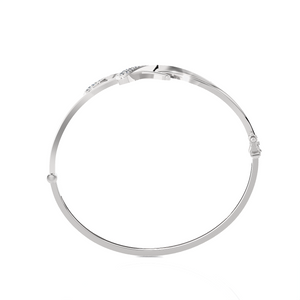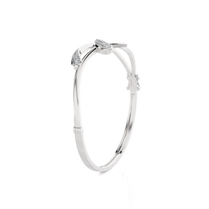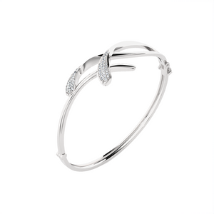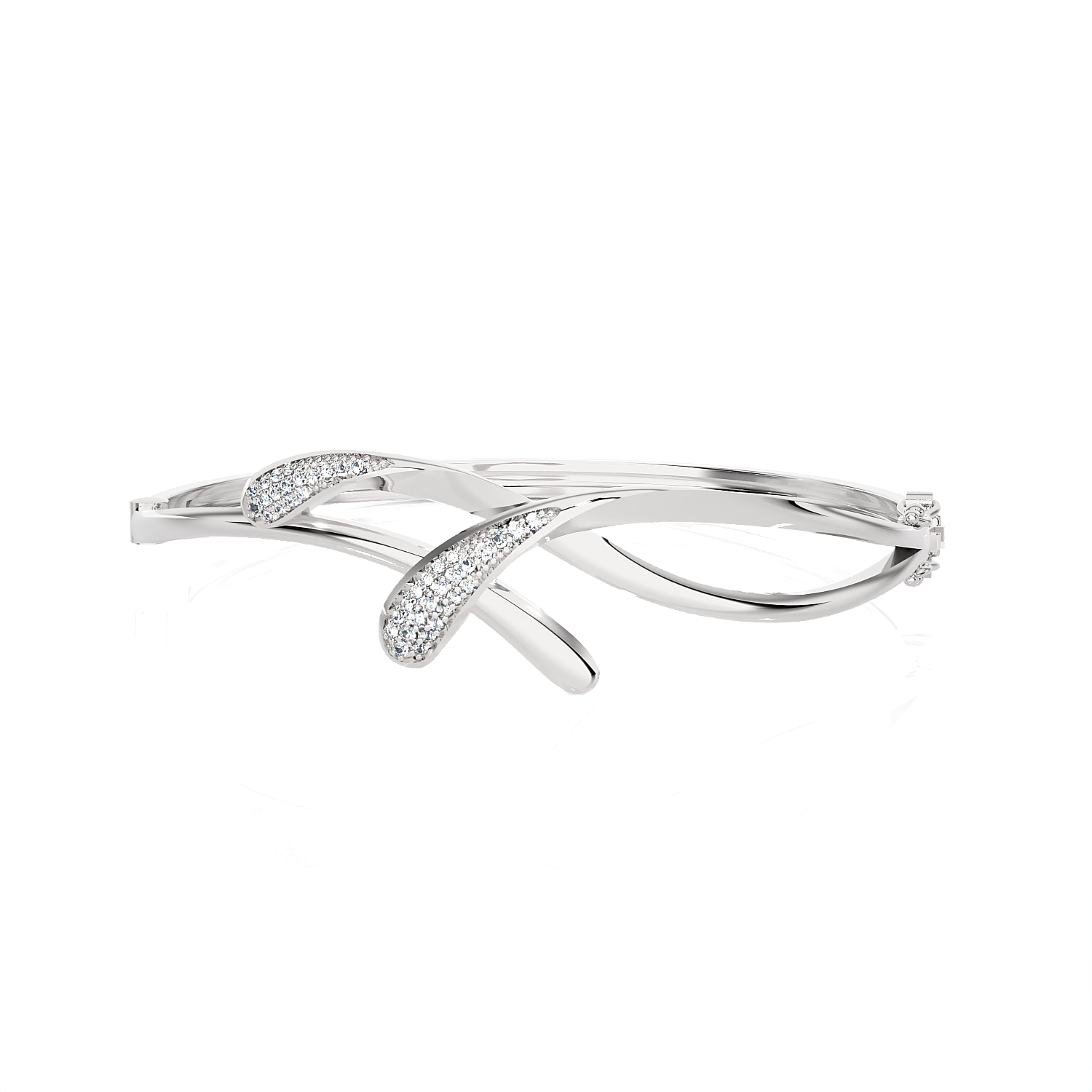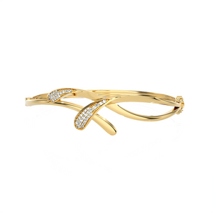 This artistic 14k/18k gold bangle features sparkling round brilliant cut diamonds pave set in petal raindrops reminiscent of a garden trellis. Tendrils of rich gold on the top give way to a lightweight bangle bracelet on the bottom, allowing this stunning design to sit comfortably on the wrist.