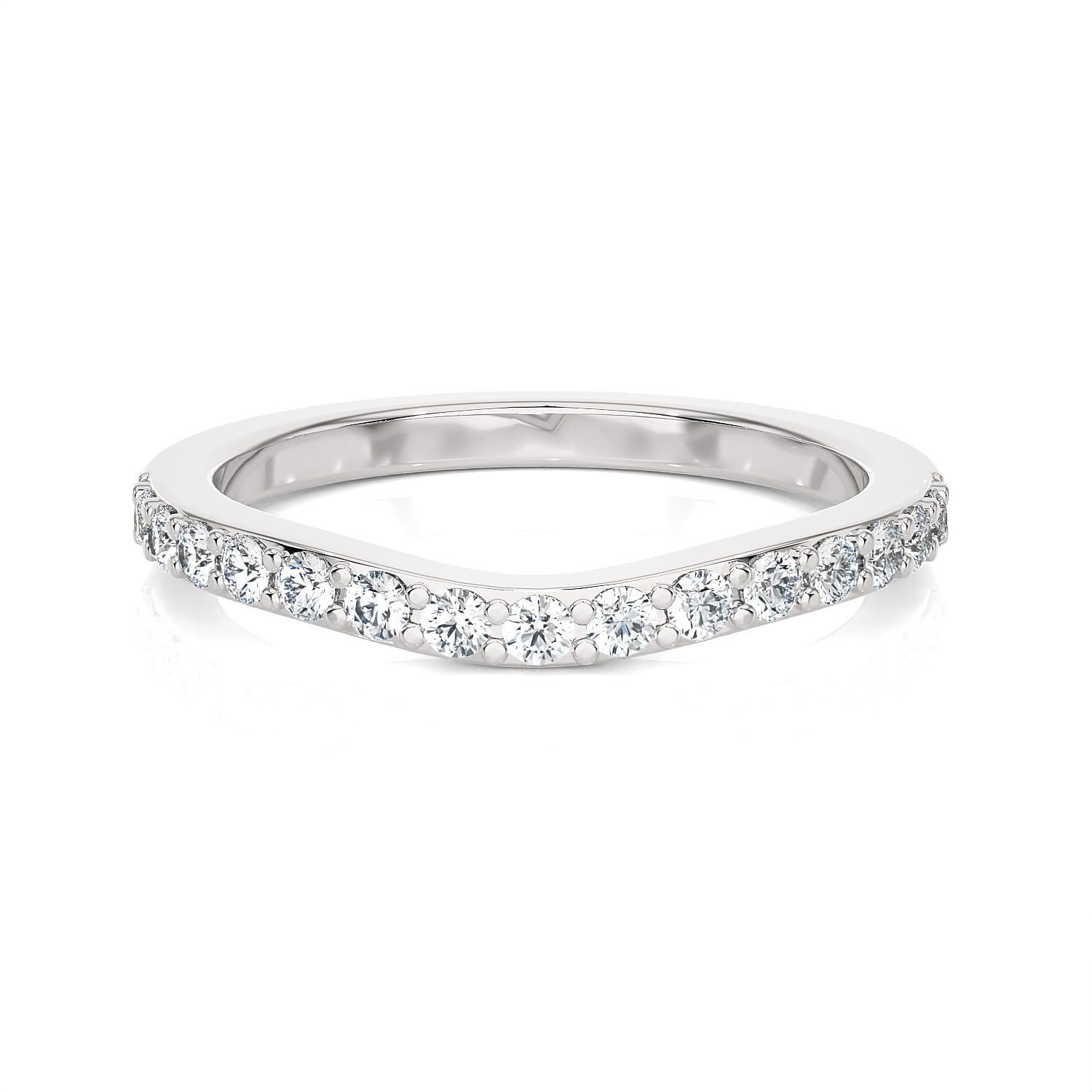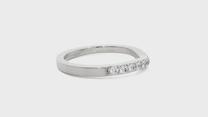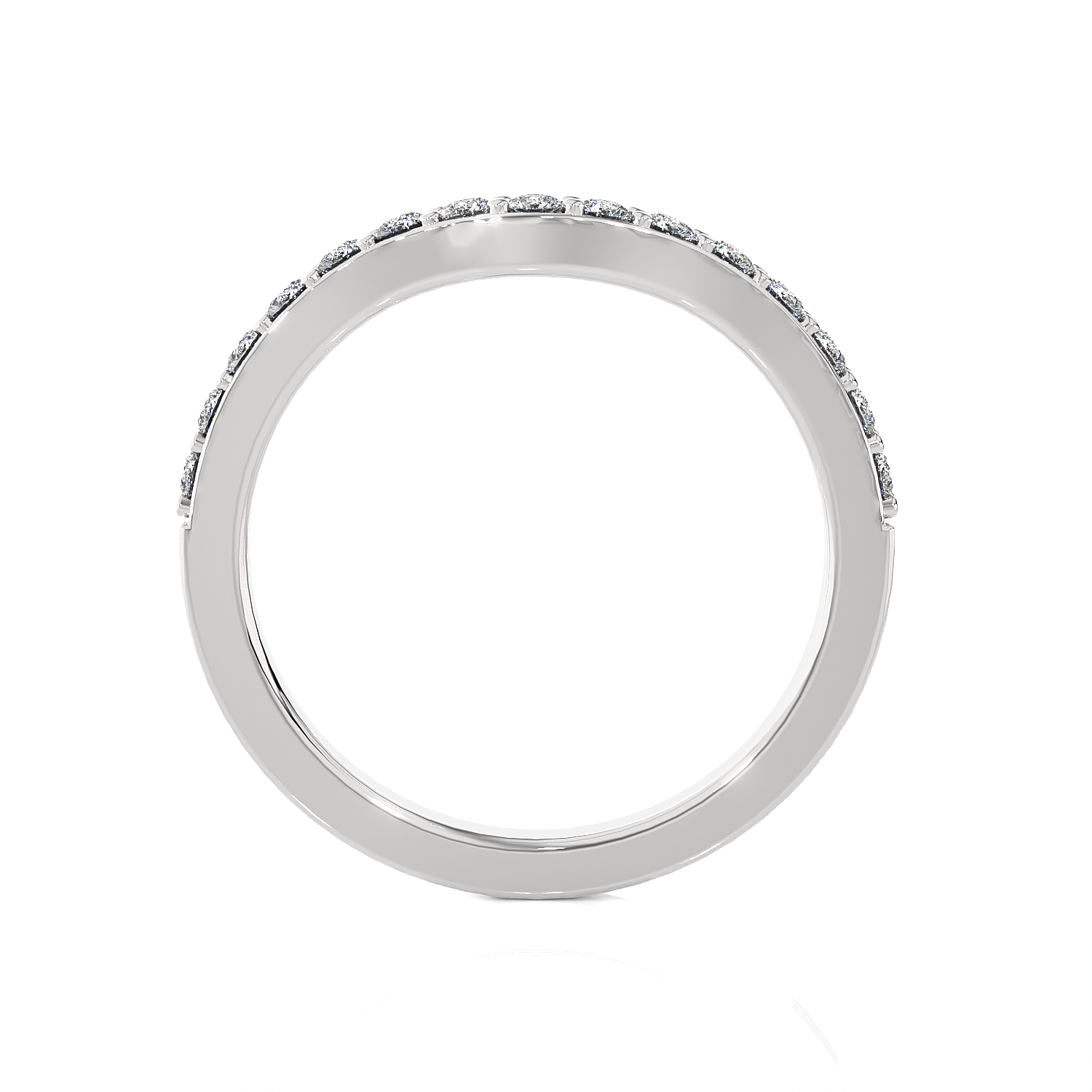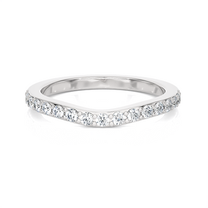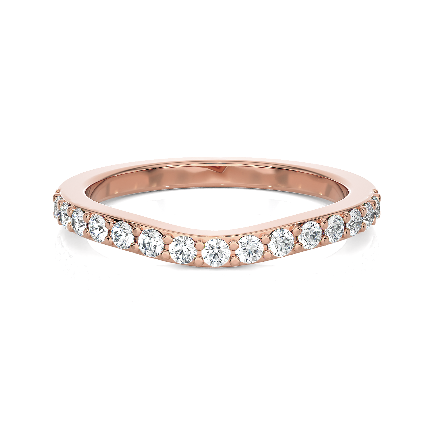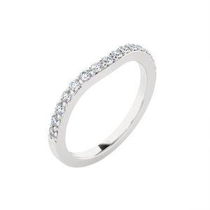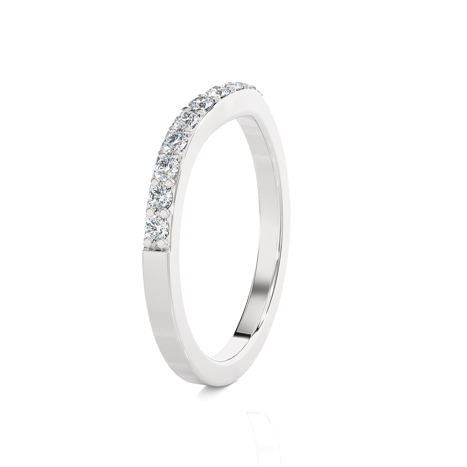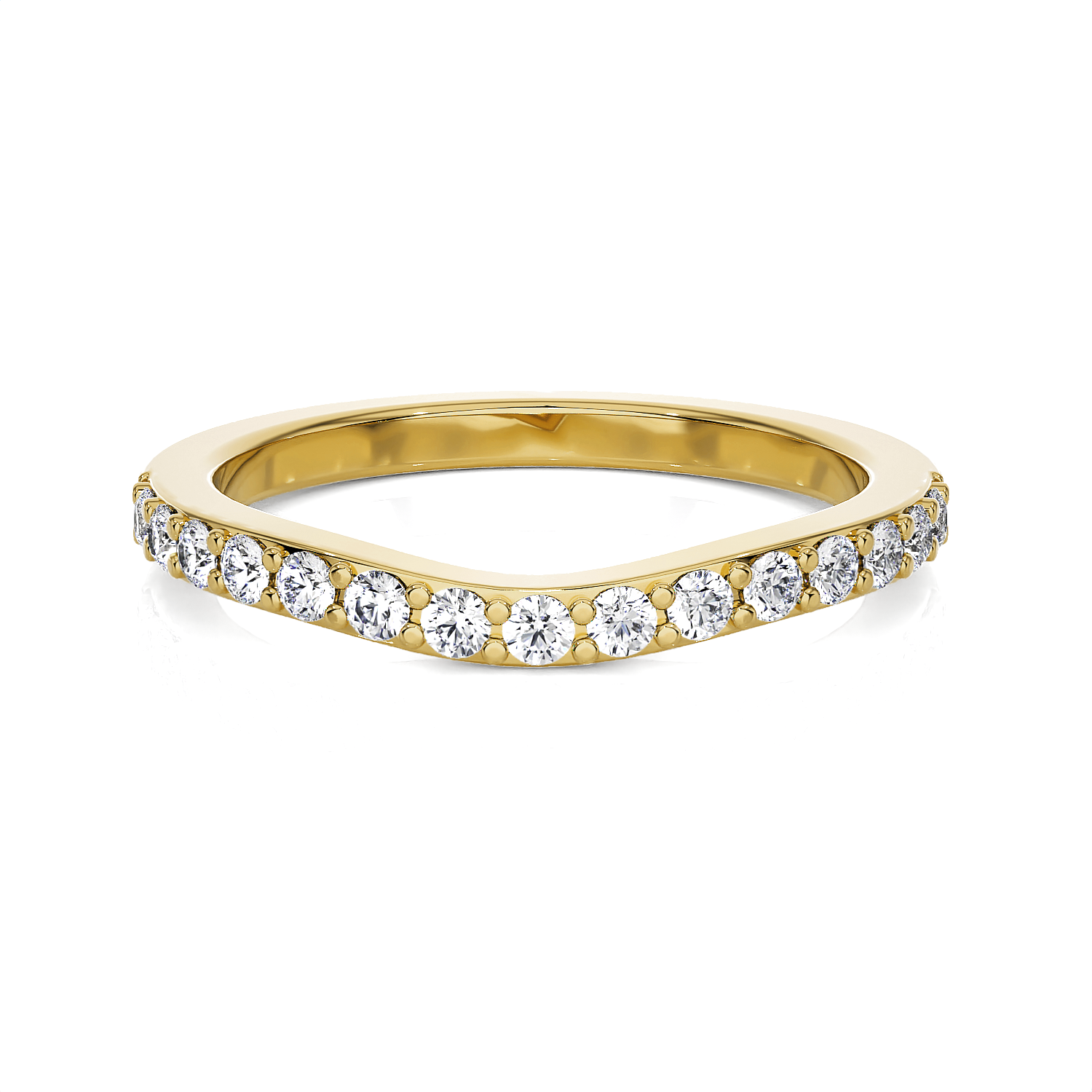 This lightweight 14k / 18K gold diamond ring features a pyramid shape on the top, offering a unique dimensional appearance on a classic band. Round brilliant cut diamonds pave-prong set on the top of this ring give it a half-eternity style. The flat sides of this slim band give it stylistic versatility? effortlessly stack it with other rings or wear it solo for an understated statement of elegance.