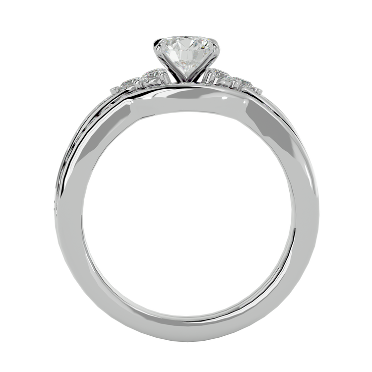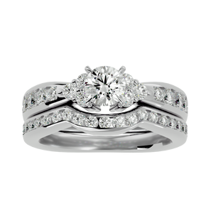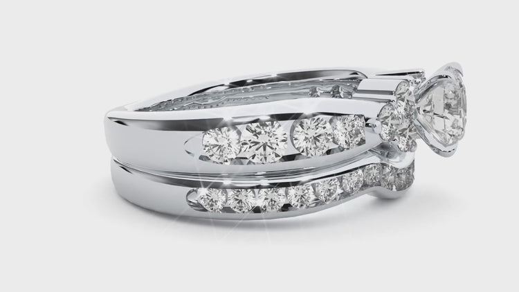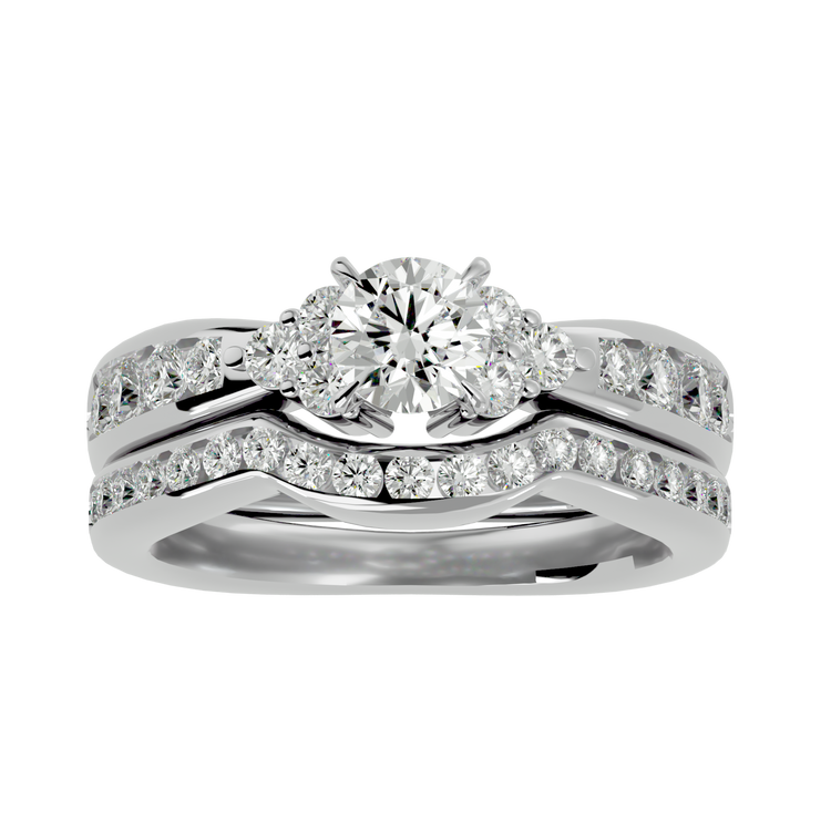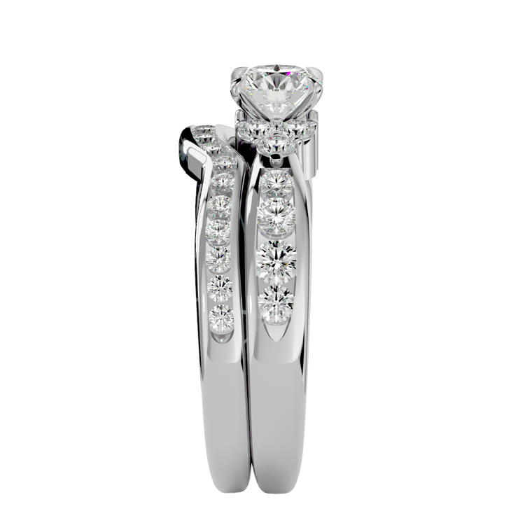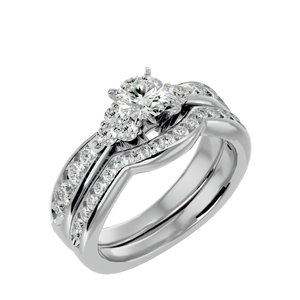 A fashionable style of a round solitaire set into a twin ring setting that accentuates the center diamond, and is marked with comparitively smaller lab grown diamonds set in the channel setting all around the rings. Can be customised as stacking rings as well.