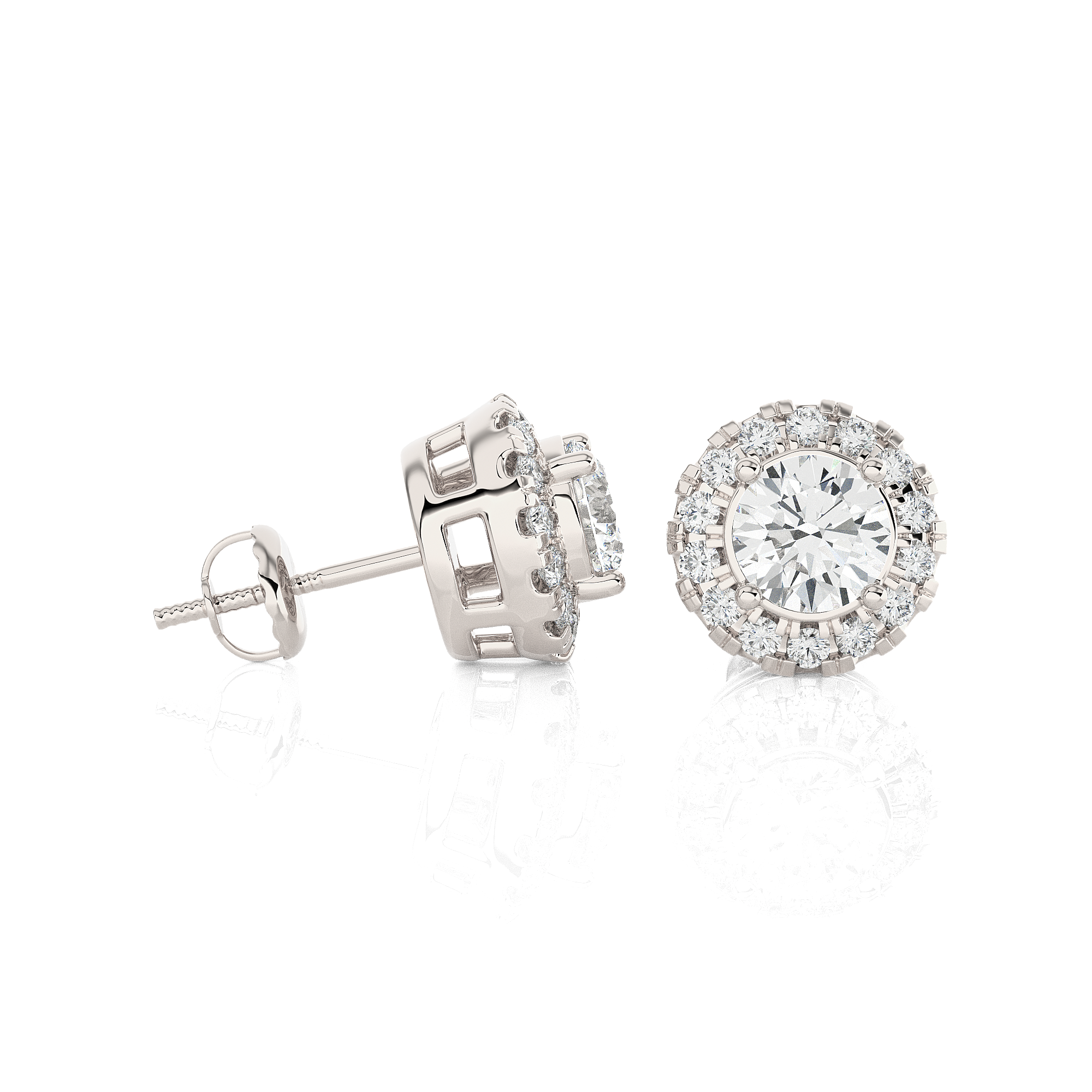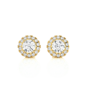 Crown any look with total luxury with these brightly polished 14k/18k gold diamond stud earrings, finely crafted with cut-out work around the perimeter of the raised basket crown. A round brilliant cut diamond solitaire secured in a four-prong bezel dazzles with smaller round brilliant cut diamonds prong set around it, creating a halo cluster. Screw backs keep these diamond stud earrings secure.