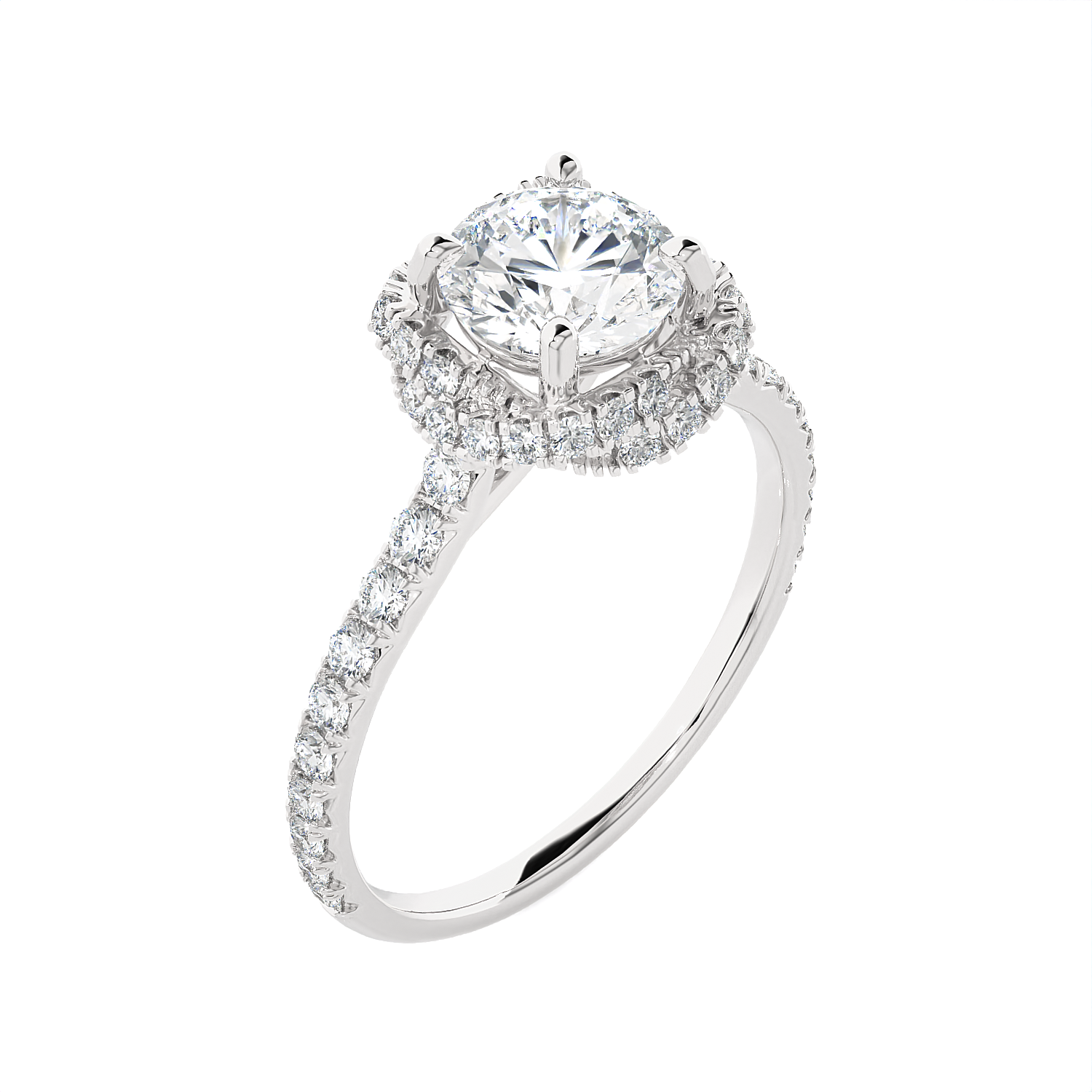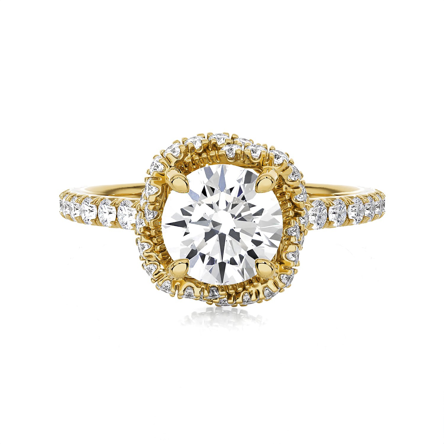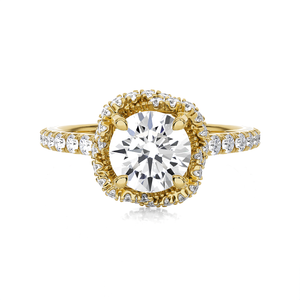 This stunning 14k/18k gold engagement ring features a glittering round brilliant cut diamond solitaire secured in a four-prong setting. The round brilliant cut diamonds prong set around this center stone and down the band gives this ring fire and elegance, all crafted from a rich shine.