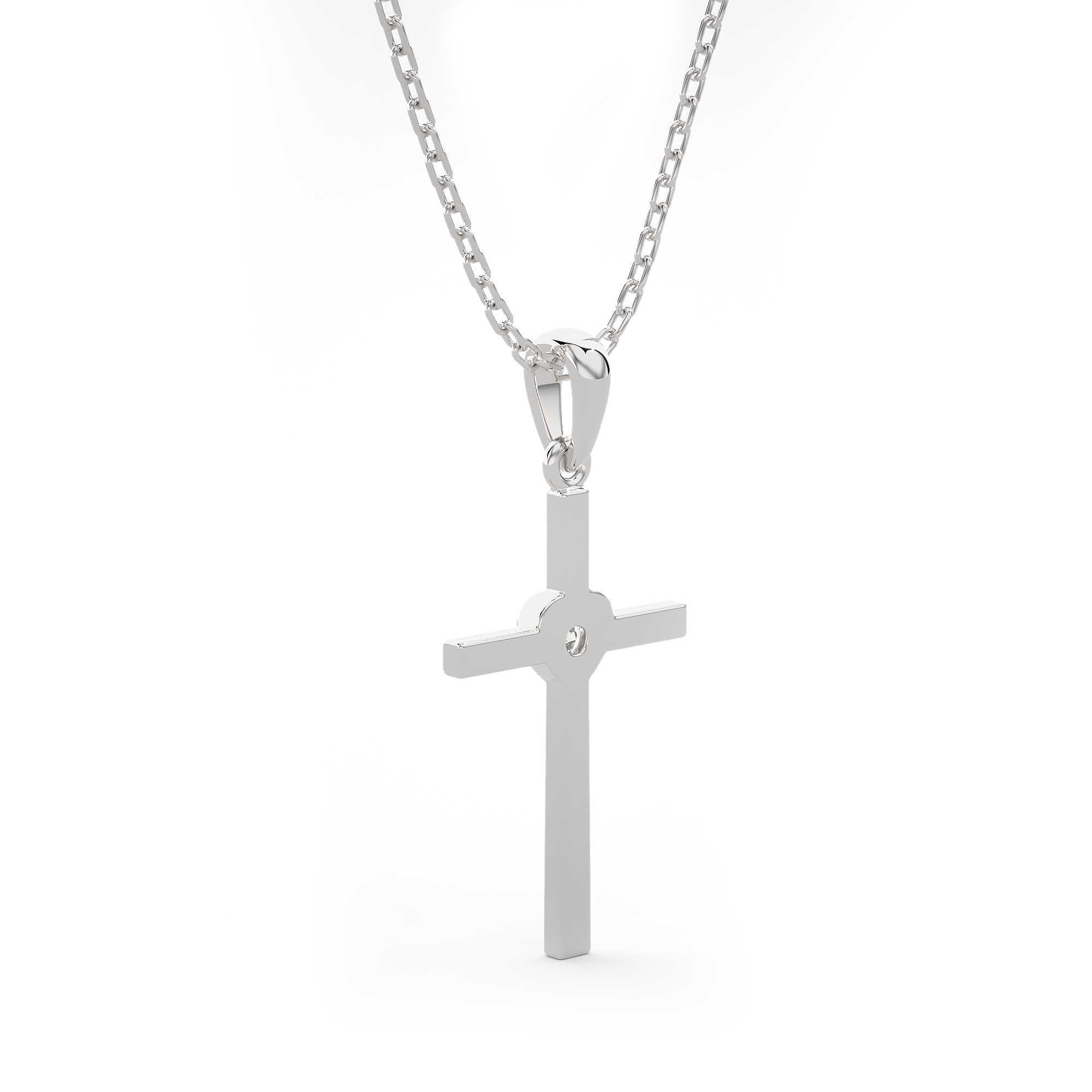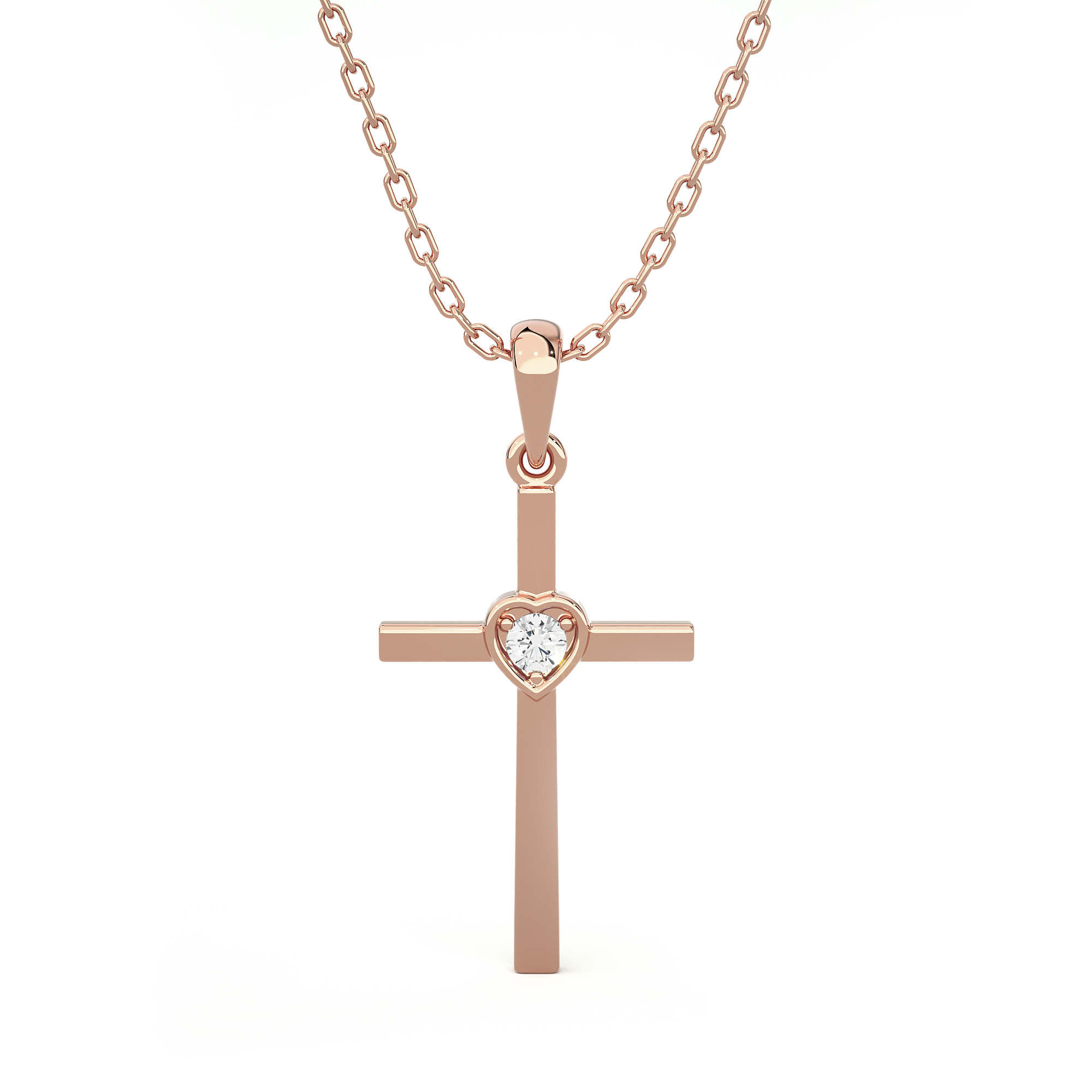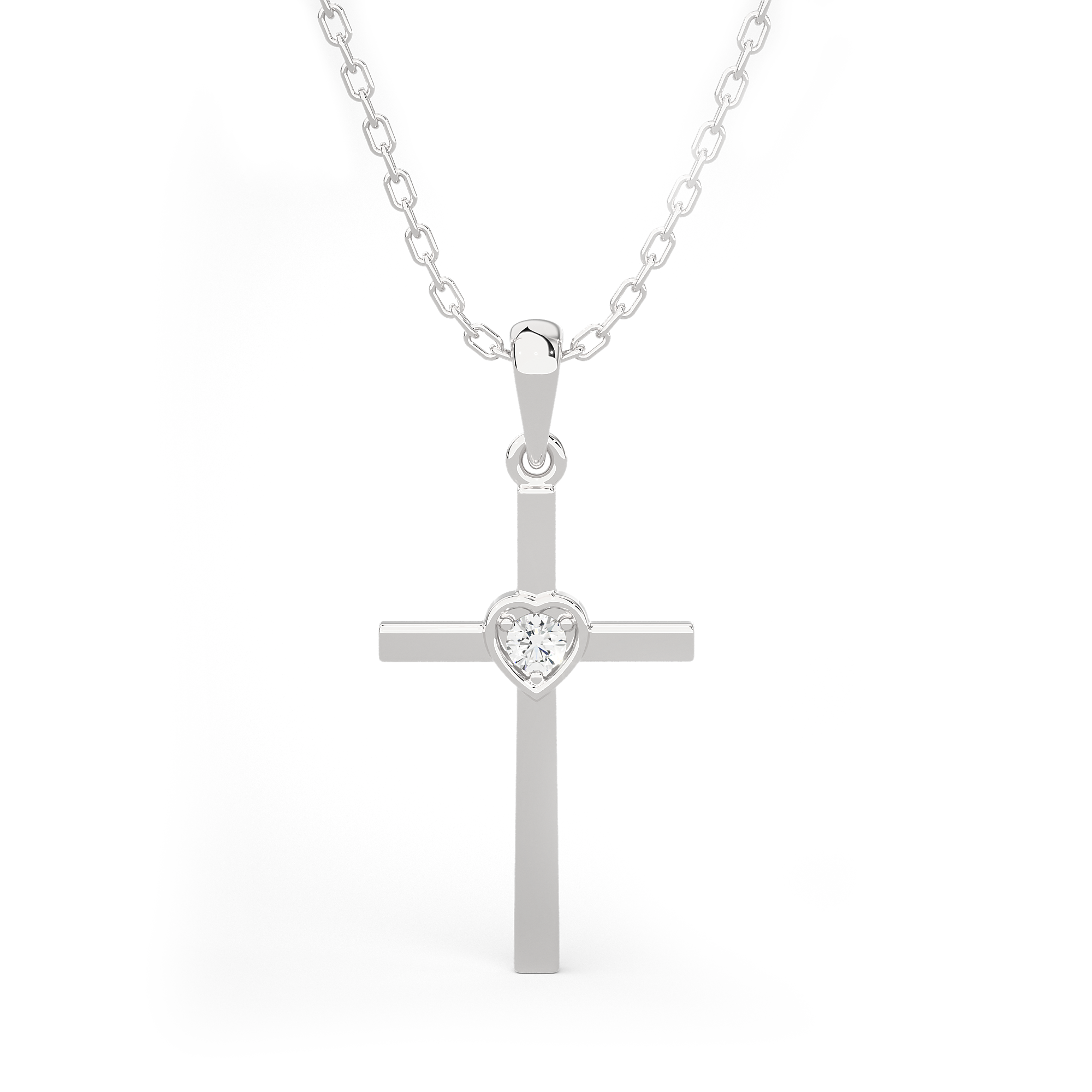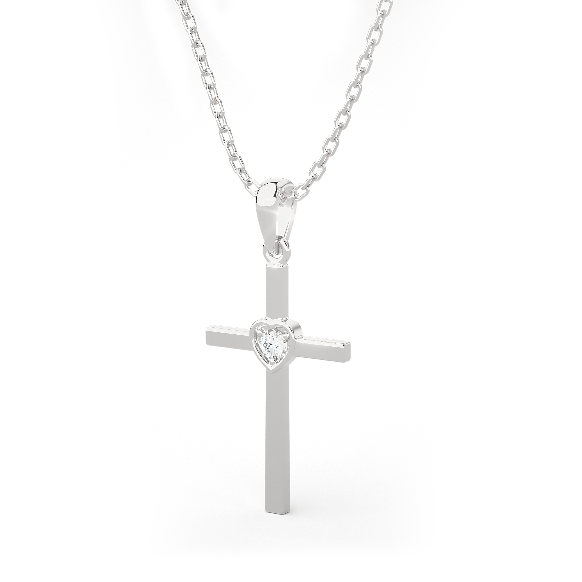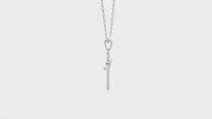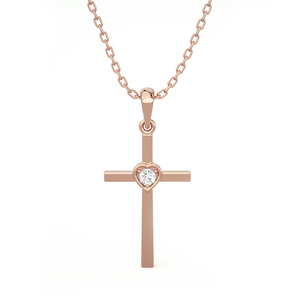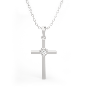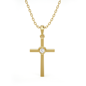 Everlasting love for your faith has been redefined with this delicate 14k/18k gold diamond Cross necklace. A simple round brilliant cut diamond prong set in a heart-shaped bezel setting lends an enchanting touch to this flat Cross. A tapered bail with a dainty cable chain threaded through it gives it the illusion it is floating.