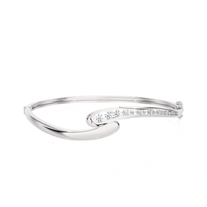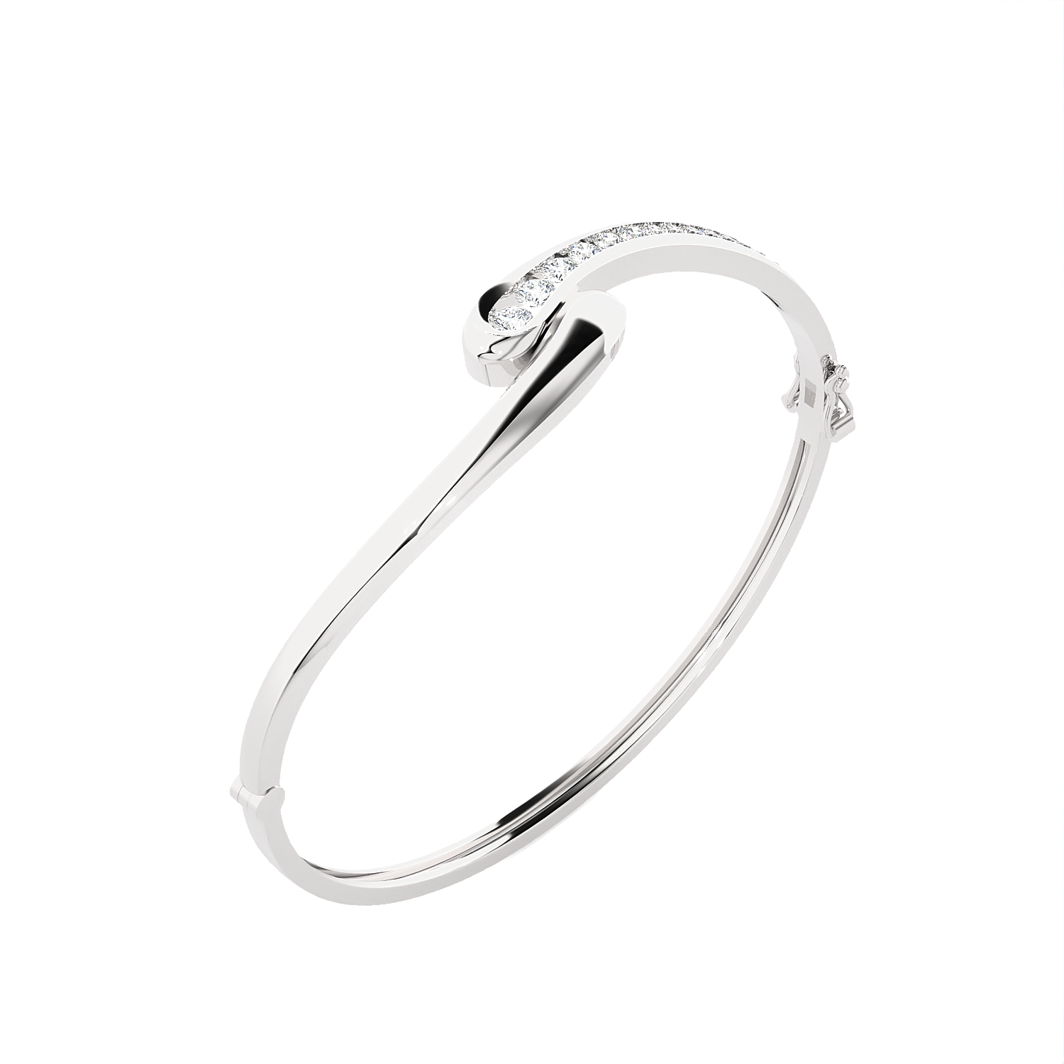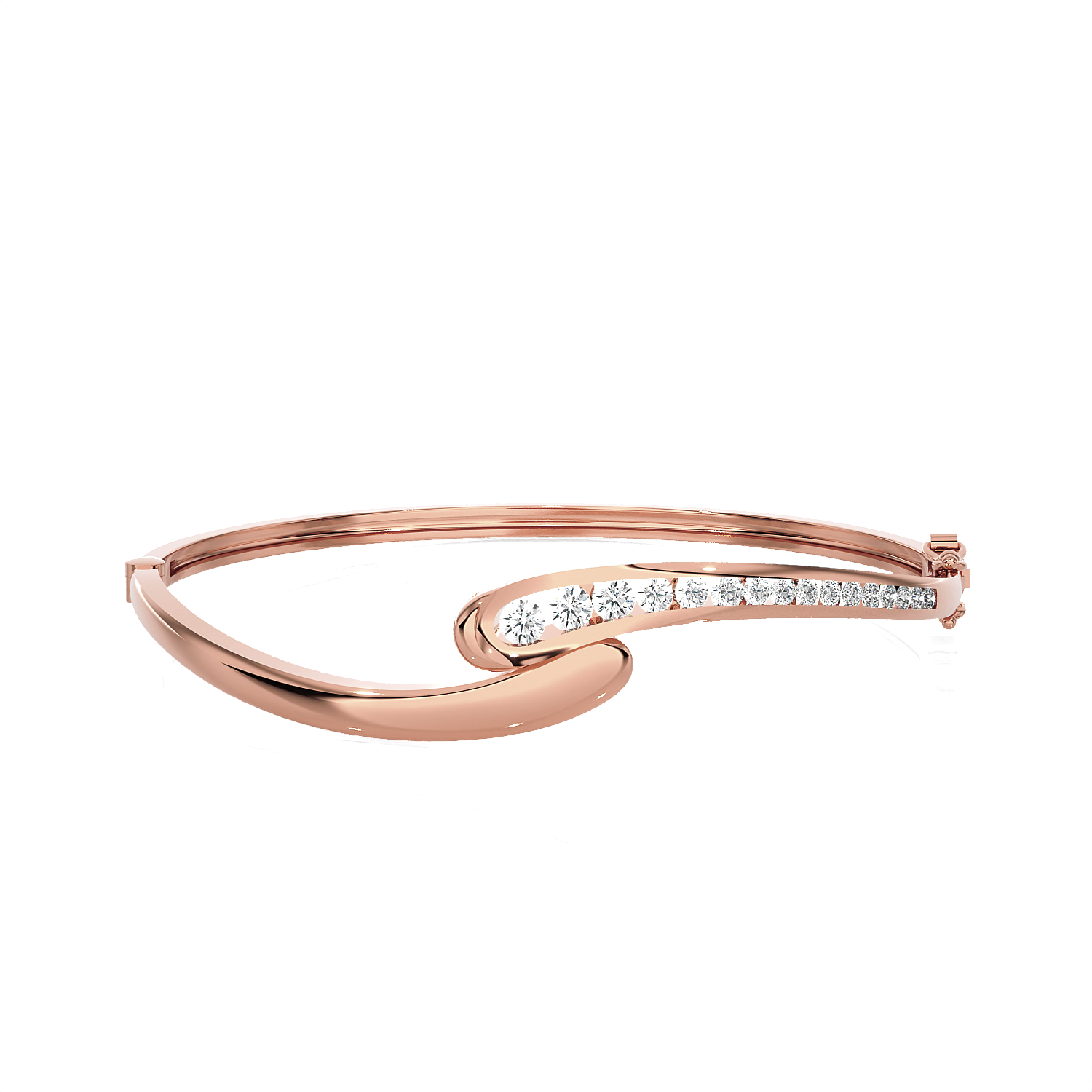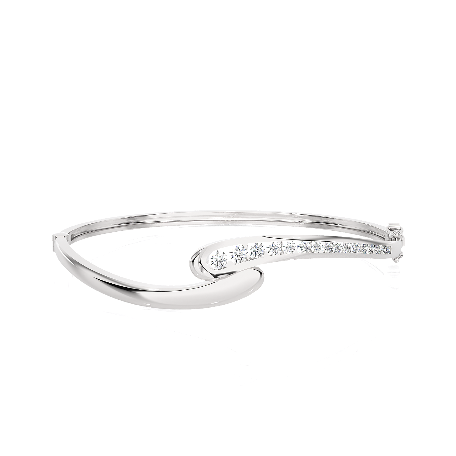 Give this brightly polished 14k/18k gold diamond bypass bangle bracelet as an anniversary, birthday, or holiday gift, perfect for showcasing your love in sophisticated style. The round brilliant cut diamonds pave set in a swirling raindrop ribbon on the top of this unique diamond bracelet highlights the wrist with pure luxury with petal-like edges, perfect for wearing day or night with its graceful design.