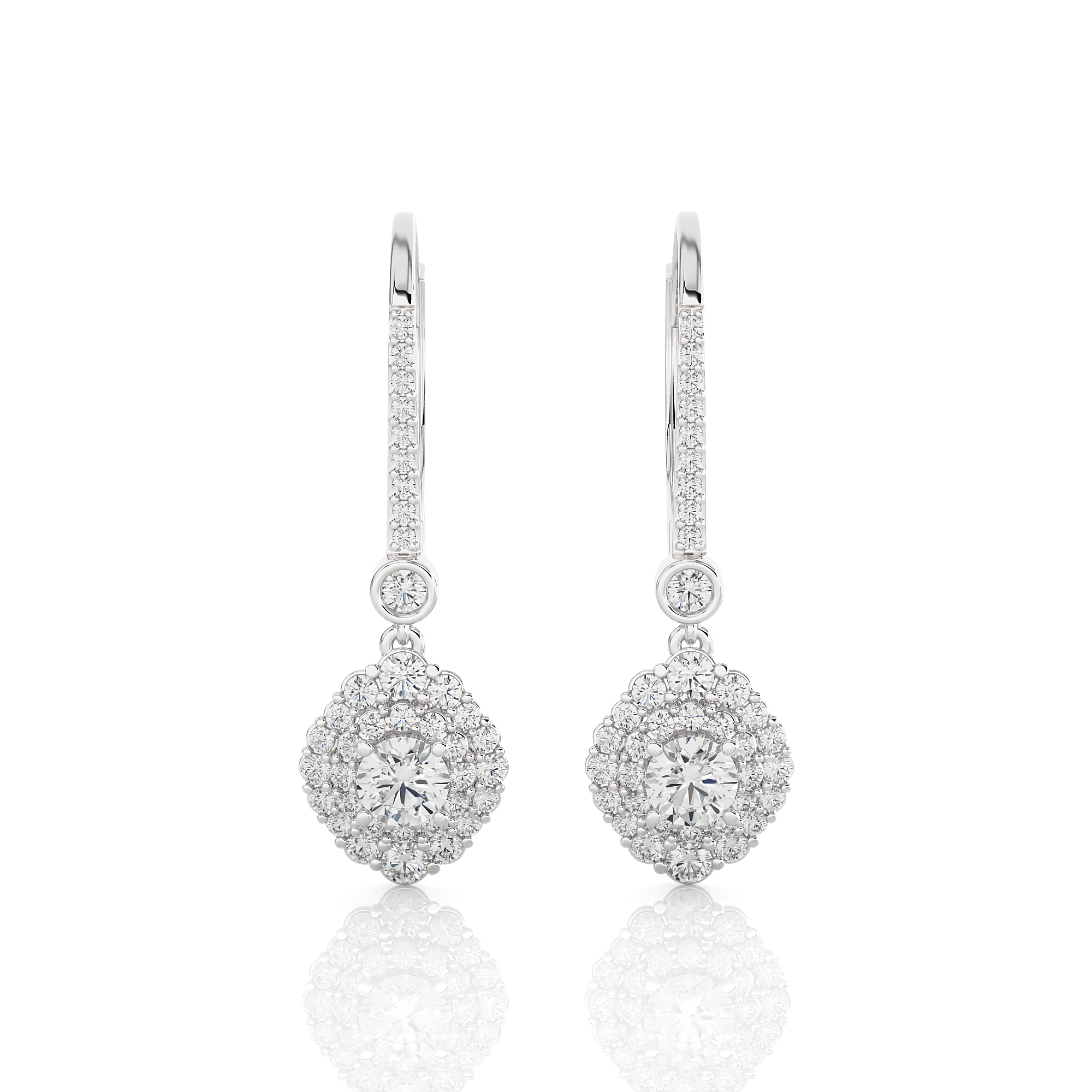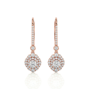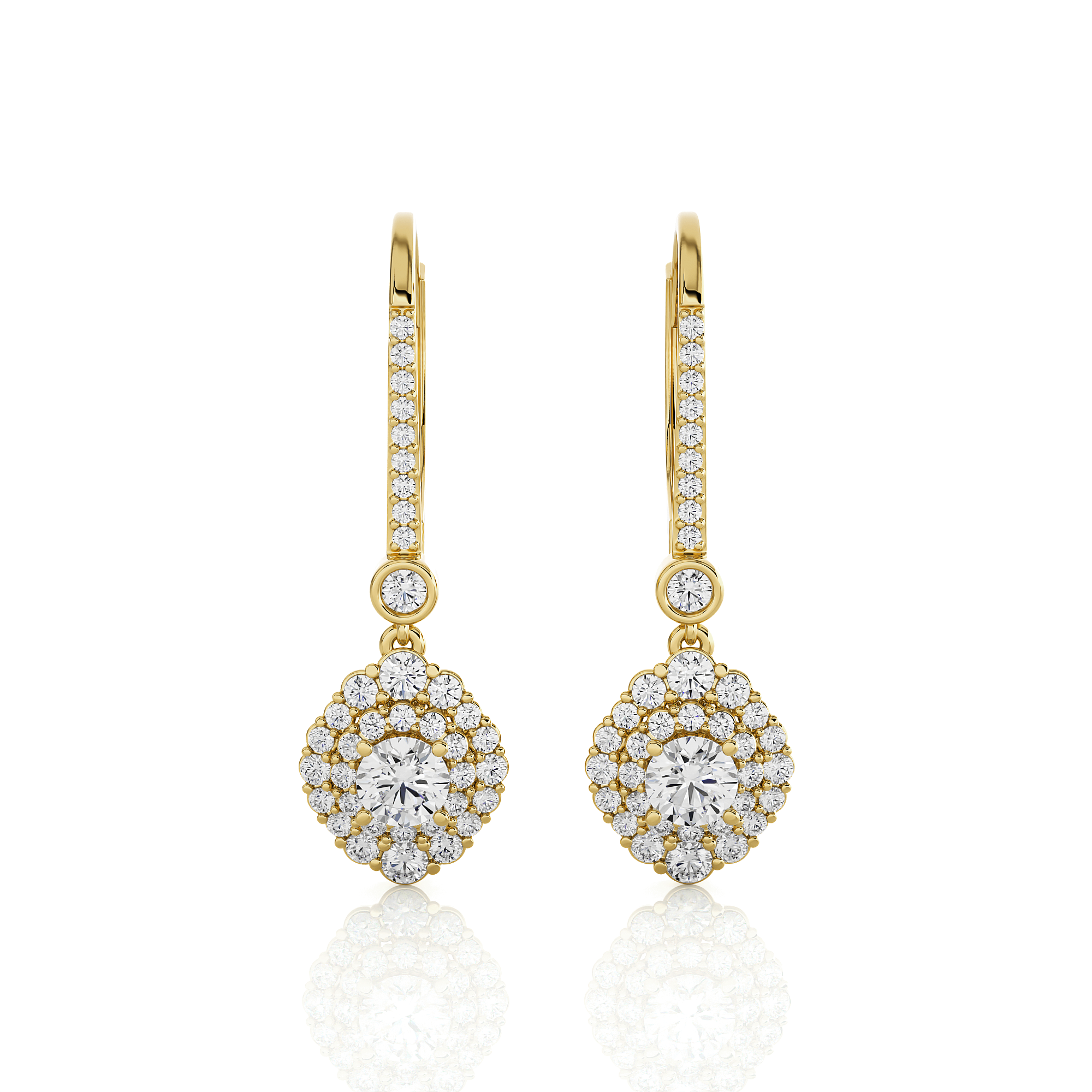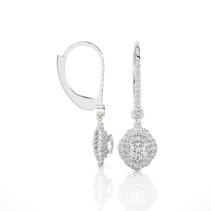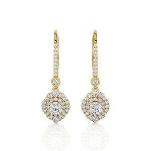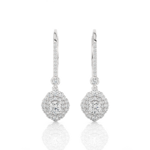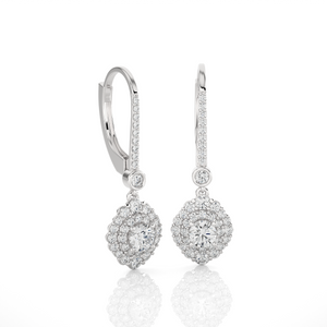 Indulge in eco-friendly, sustainable luxury with these gorgeous 14k/18k gold dangle earrings. Glittering round brilliant cut lab grown diamonds cluster prong set in double halo clusters frames diamond solitaires on the bottom. Additional small stones on each earring front finish the design.