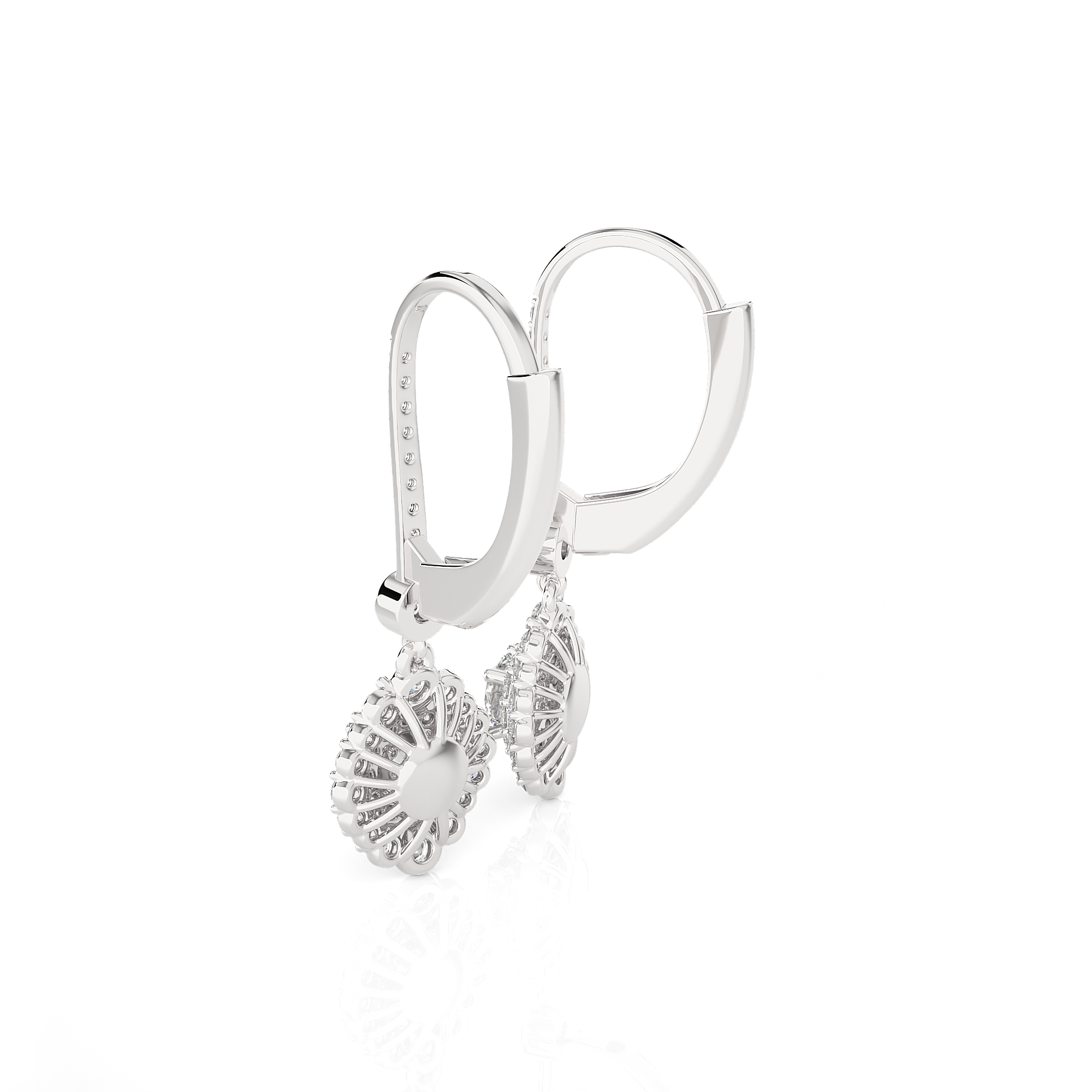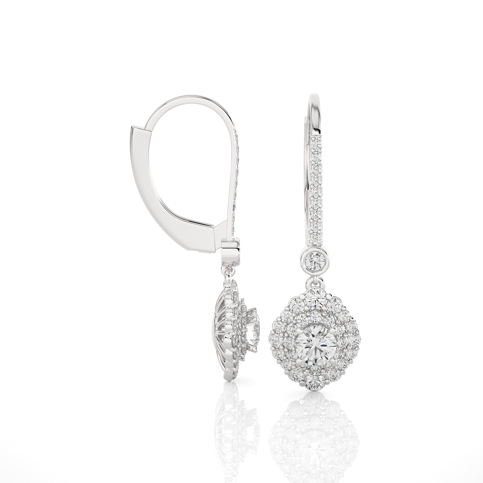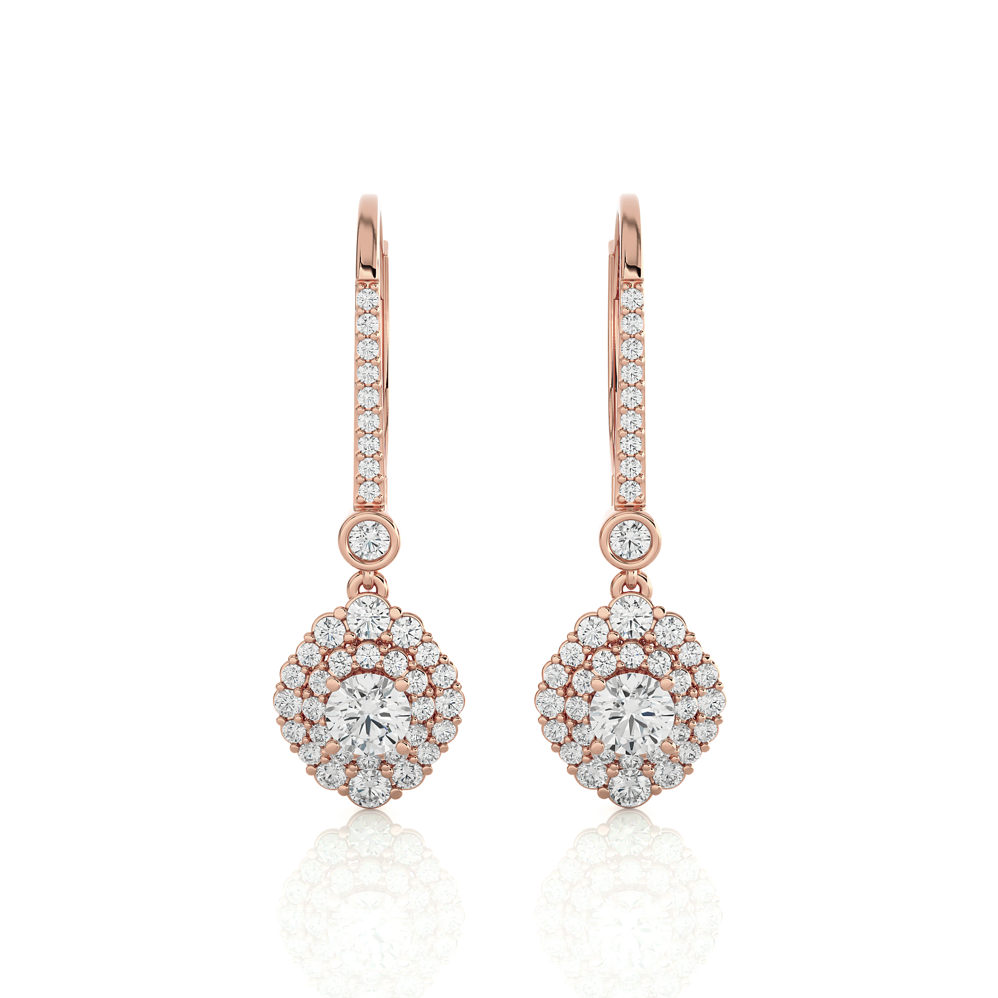Indulge in eco-friendly, sustainable luxury with these gorgeous 14k/18k gold dangle earrings. Glittering round brilliant cut lab grown diamonds cluster prong set in double halo clusters frames diamond solitaires on the bottom. Additional small stones on each earring front finish the design.