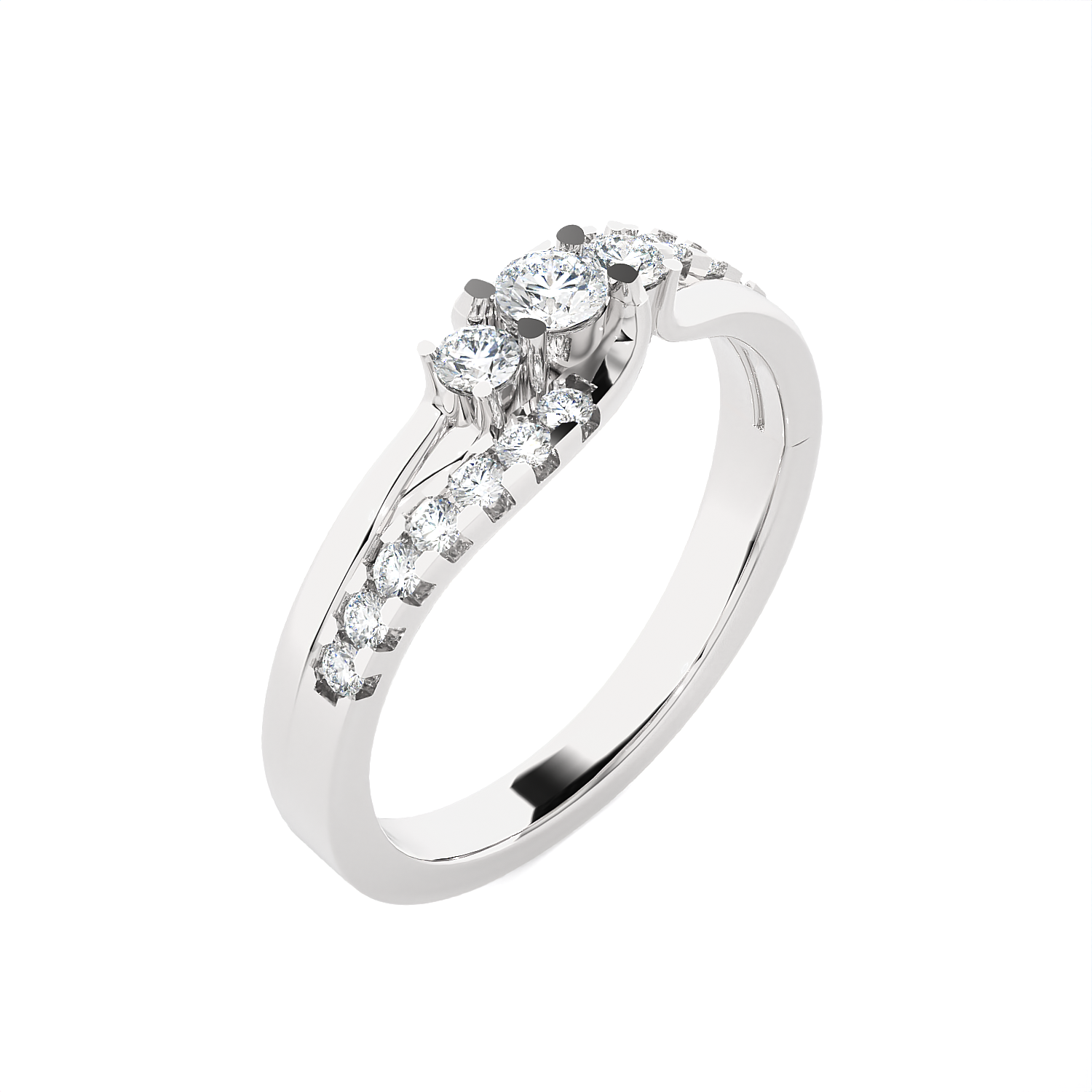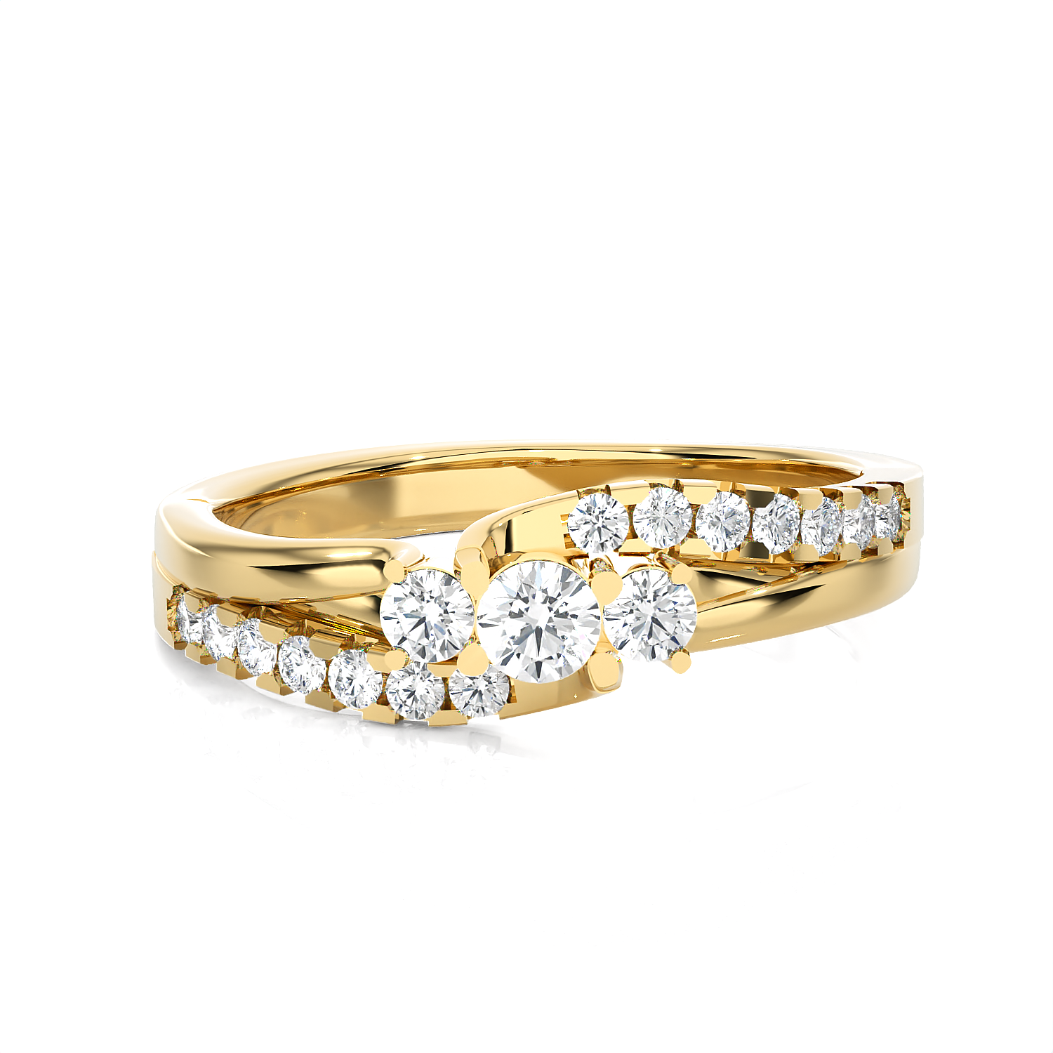 This brightly polished 14k gold engagement ring features a classic three-stone style with round brilliant cut lab-grown diamond solitaires in shared prong settings, representing the past, present, and future of happy moments and memories spent together. Smaller round brilliant cut diamonds pave set on the curved band give this brightly polished ring a graceful appearance as it glistens on the finger.
